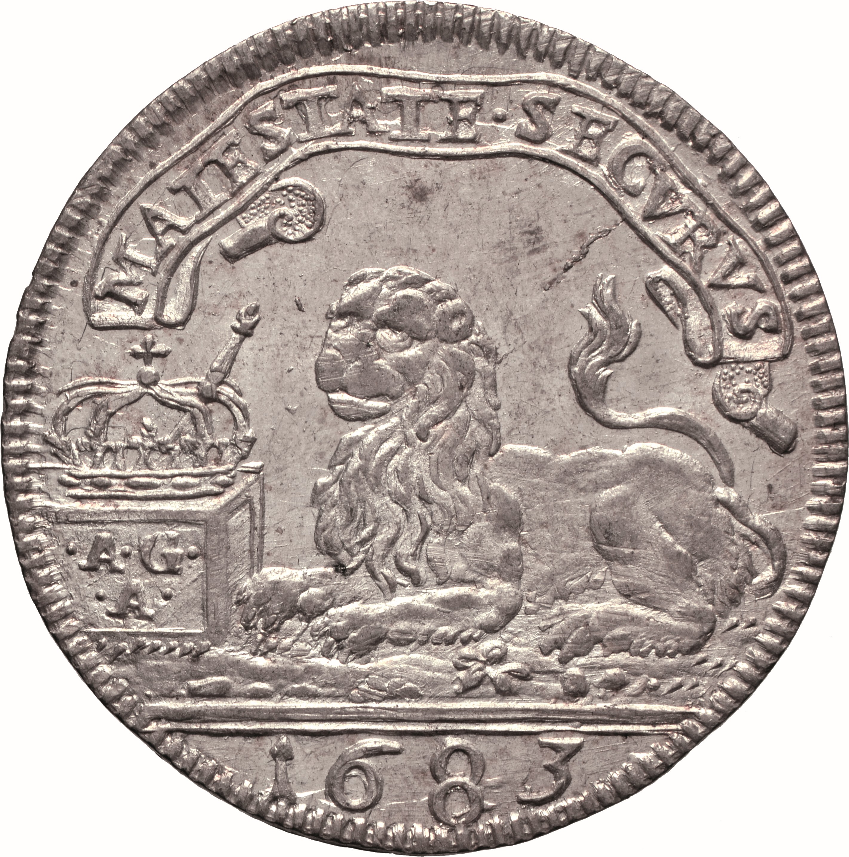 Dritto: Busto del re a testa nuda con lunga capigliatura volto a d., con corazza ornata da sciarpa e cinta dal collare del Toson d’oro. Campo monetale delimitato da filetto dentellato. Rovescio: Un leone accovacciato verso s.; a sinistra una base con le sigle ∙ A ∙ G ∙ | ∙ A ∙, sulla quale sono poggiati la corona e lo scettro; in esergo, 1683. Campo monetale delimitato da filetto dentellato