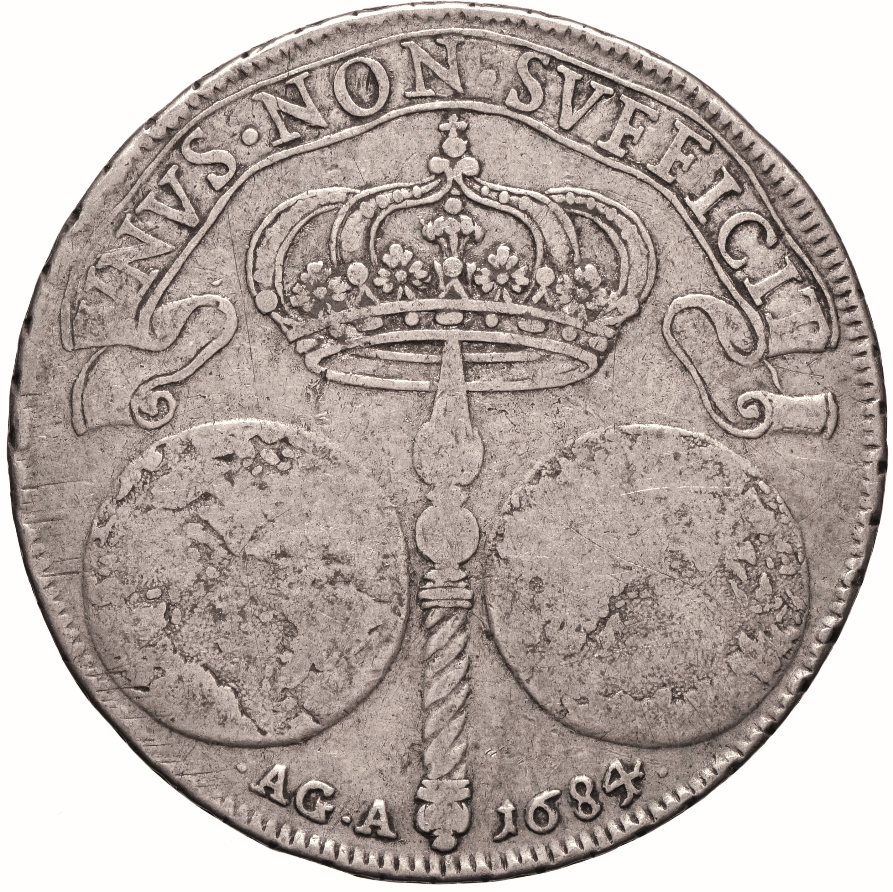 Dritto: Busto del re a testa nuda con lunga capigliatura volto a d., con corazza ornata da sciarpa e cinta dal collare del Toson d’oro; sotto, in legatura, IMDC. Campo monetale delimitato da filetto dentellato. Rovescio: Scettro sormontato da corona reale fra due emisferi terrestri; nel campo in basso: a s., A G | ∙ A ∙, a d., 1684. Campo monetale delimitato da filetto dentellato