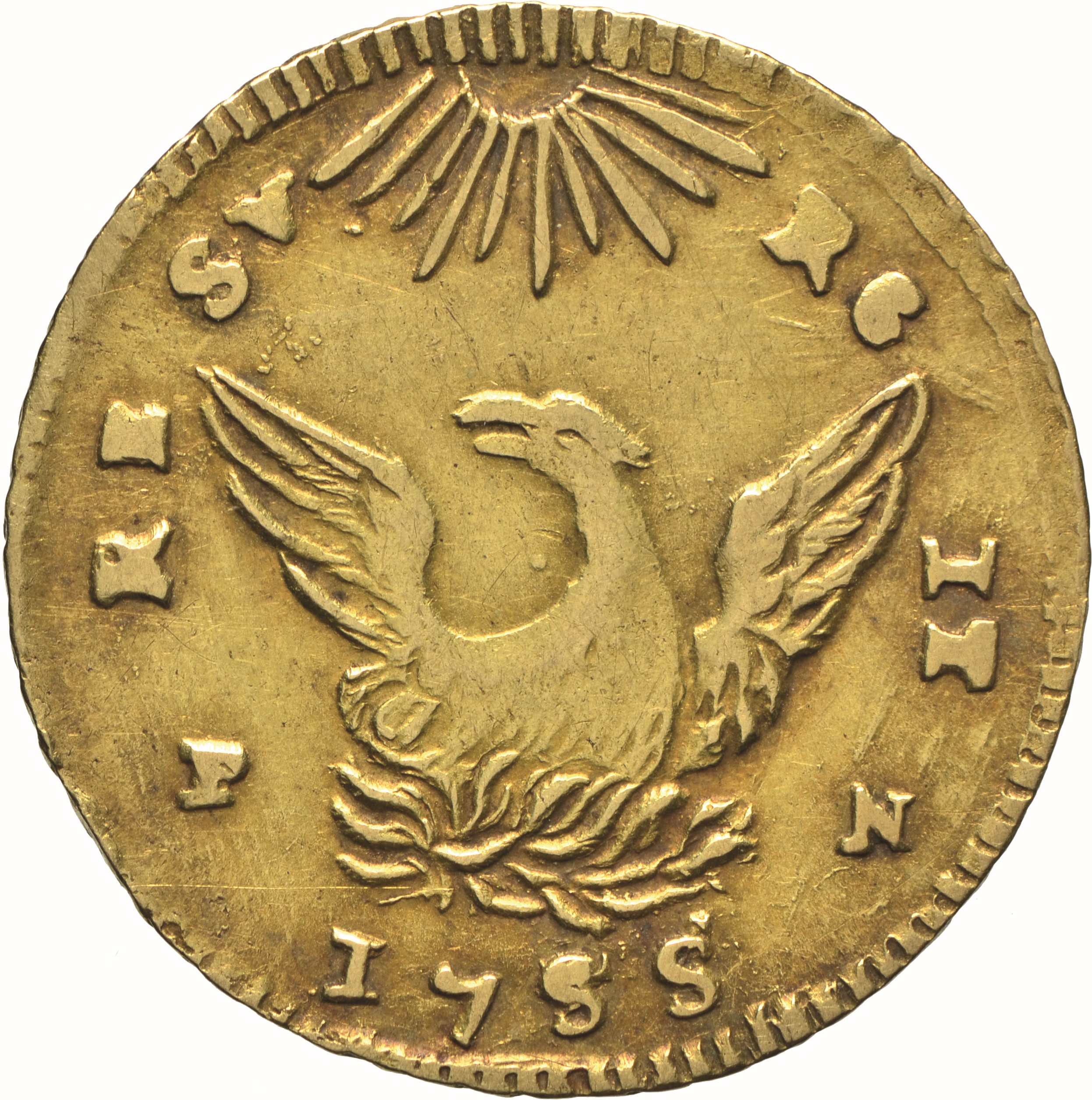 Dritto: Busto ammantato del re volto a d., con testa nuda e capelli fluenti. Campo monetale delimitato da filetto dentellato. Rovescio: Illuminata dal sole, la fenice ad ali spiegate e con testa volta a sinistra risorge dalle fiamme; ai lati delle fiamme, P - N; sotto, 1755. Campo monetale delimitato da filetto dentellato