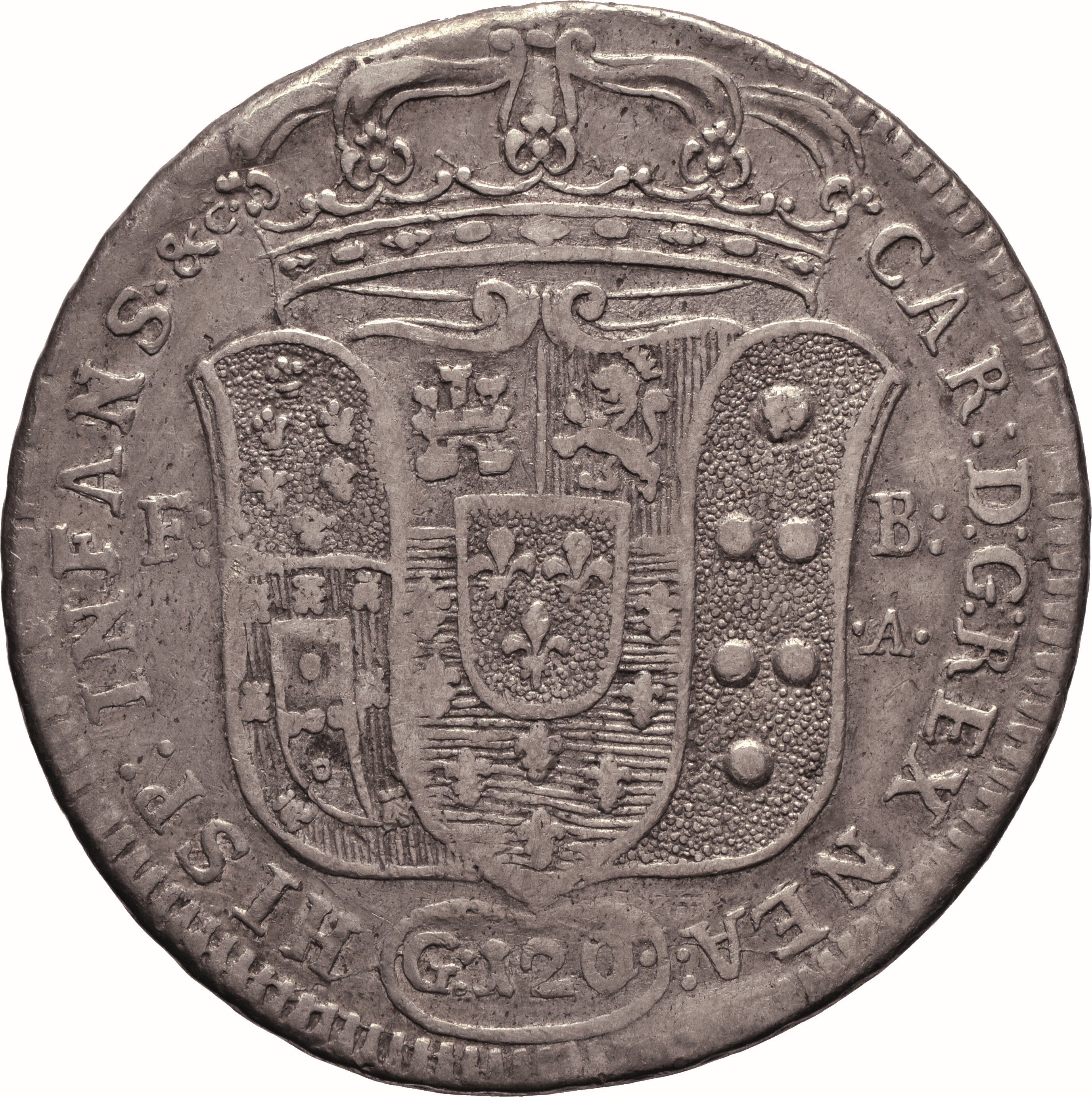 Dritto: Il Sebeto sdraiato sulla riva del mare, con braccio destro adagiato su di un’urna da cui scorre acqua e nella mano sinistra un badile; dietro, un pino, e sullo sfondo, il Vesuvio. In esergo: De 1734 ∙ G:. Campo monetale delimitato da filetto dentellato. Rovescio: Scudo coronato in cartella, interzato in palo: nel 1°, troncato dei Farnese e di Portogallo; nel 2°, troncato: in a), partito di Castiglia e León, in b), di Angiò; nel 3°, dei Medici. Sul tutto, scudetto dei Borbone. Nel campo, ai lati, F: / B: | ·A·; sotto lo scudo, in cartella, G: 120 ·. Campo monetale delimitato da filetto dentellato