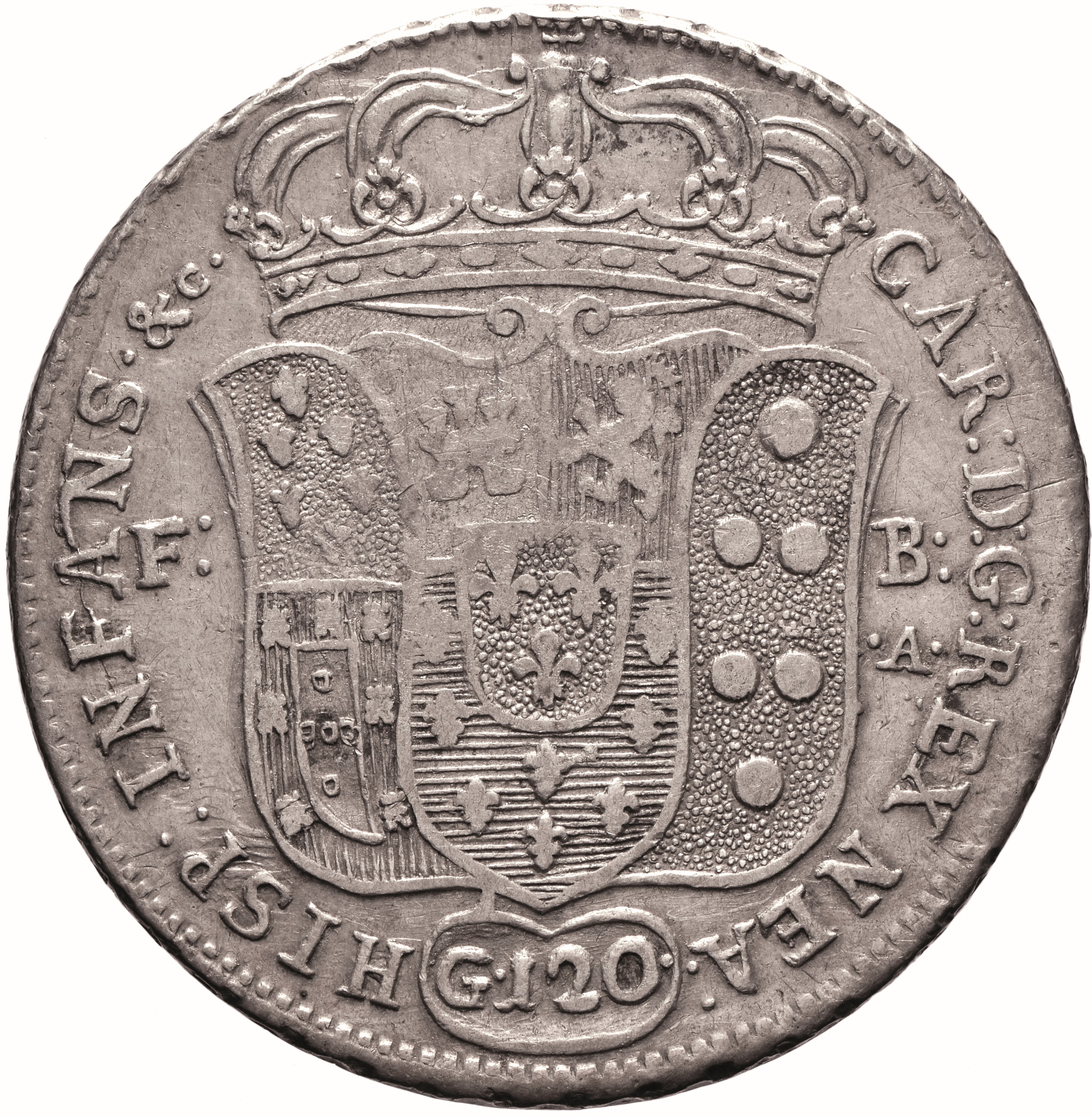 Dritto: Il Sebeto sdraiato sulla riva del mare, con braccio destro adagiato su di un’urna da cui scorre acqua e nella mano sinistra un badile; dietro, un pino, e sullo sfondo, il Vesuvio. In esergo: De 1734 ∙ G:. Campo monetale delimitato da filetto dentellato. Rovescio: Scudo coronato in cartella, interzato in palo: nel 1°, troncato dei Farnese e di Portogallo; nel 2°, troncato: in a), partito di Castiglia e León, in b), di Angiò; nel 3°, dei Medici. Sul tutto, scudetto dei Borbone. Nel campo, ai lati, F: / B: | ·A·; sotto lo scudo, in cartella, G: 120 ·. Campo monetale delimitato da filetto dentellato