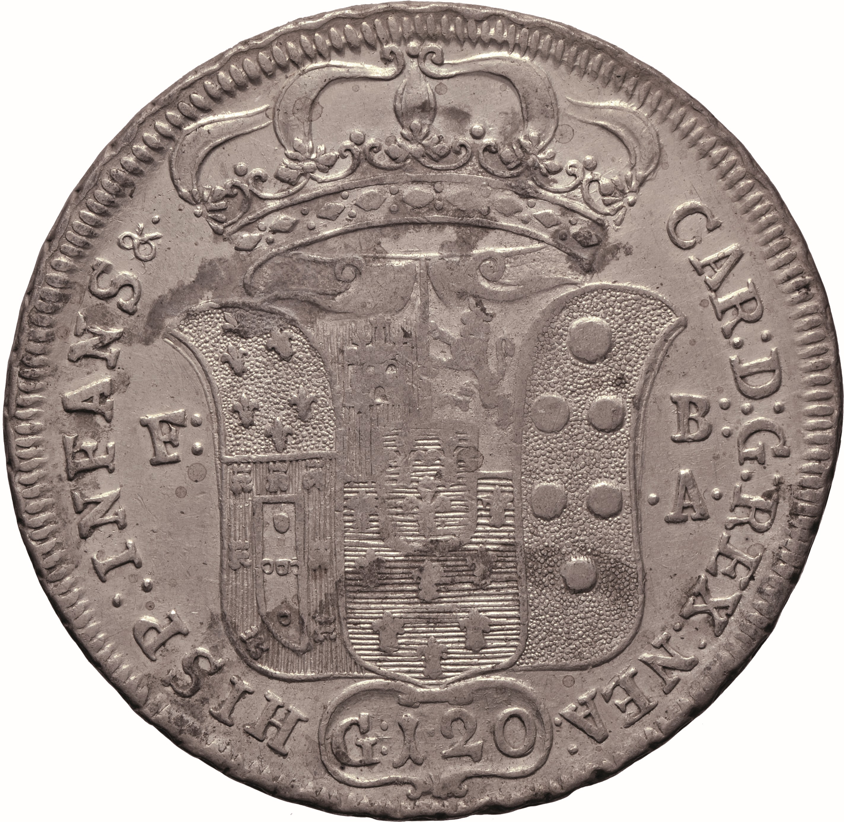 Dritto: Il Sebeto sdraiato sulla riva del mare, con braccio destro adagiato su di un’urna da cui scorre acqua e nella mano sinistra un badile; dietro, un pino, e sullo sfondo, il Vesuvio. In esergo: G: 1735. H. . Campo monetale delimitato da filetto dentellato. Rovescio: Scudo coronato in cartella, interzato in palo: nel 1°, troncato dei Farnese e di Portogallo; nel 2°, troncato: in a), partito di Castiglia e León, in b), di Angiò; nel 3°, dei Medici. Sul tutto, scudetto dei Borbone. Nel campo, ai lati, F: / B: | ·A·; sotto lo scudo, in cartella, G: 120. Campo monetale delimitato da filetto dentellato
