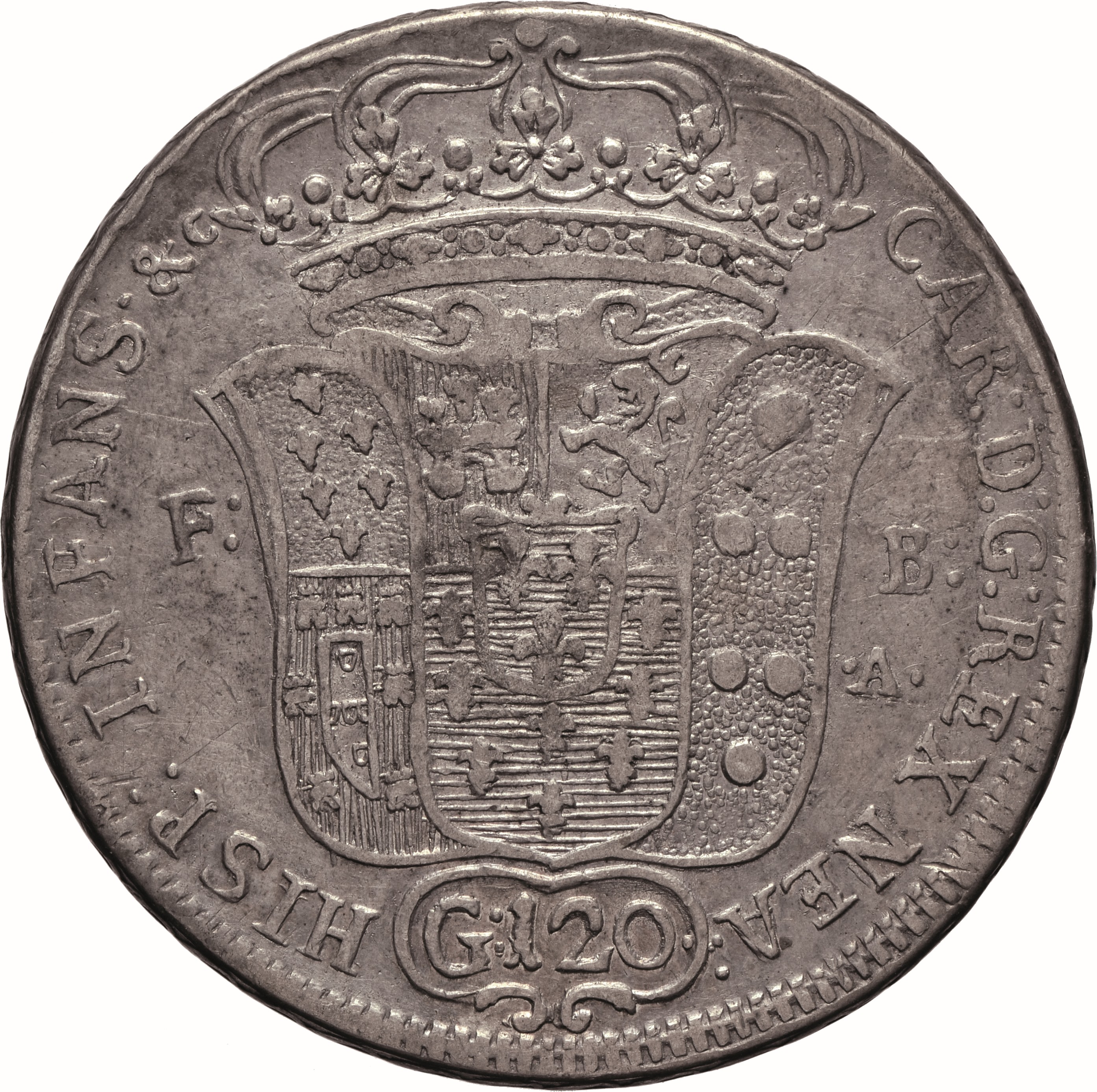 Dritto: Il Sebeto sdraiato sulla riva del mare, con braccio destro adagiato su di un’urna da cui scorre acqua e nella mano sinistra un badile; dietro, un pino, e sullo sfondo, il Vesuvio. In esergo: De 1736 ∙ G:. Campo monetale delimitato da filetto dentellato. Rovescio: Scudo coronato in cartella, interzato in palo: nel 1°, troncato dei Farnese e di Portogallo; nel 2°, troncato: in a), partito di Castiglia e León, in b), di Angiò; nel 3°, dei Medici. Sul tutto, scudetto dei Borbone. Nel campo, ai lati, F: / B: | ·A·; sotto lo scudo, in cartella, G: 120. Campo monetale delimitato da filetto dentellato