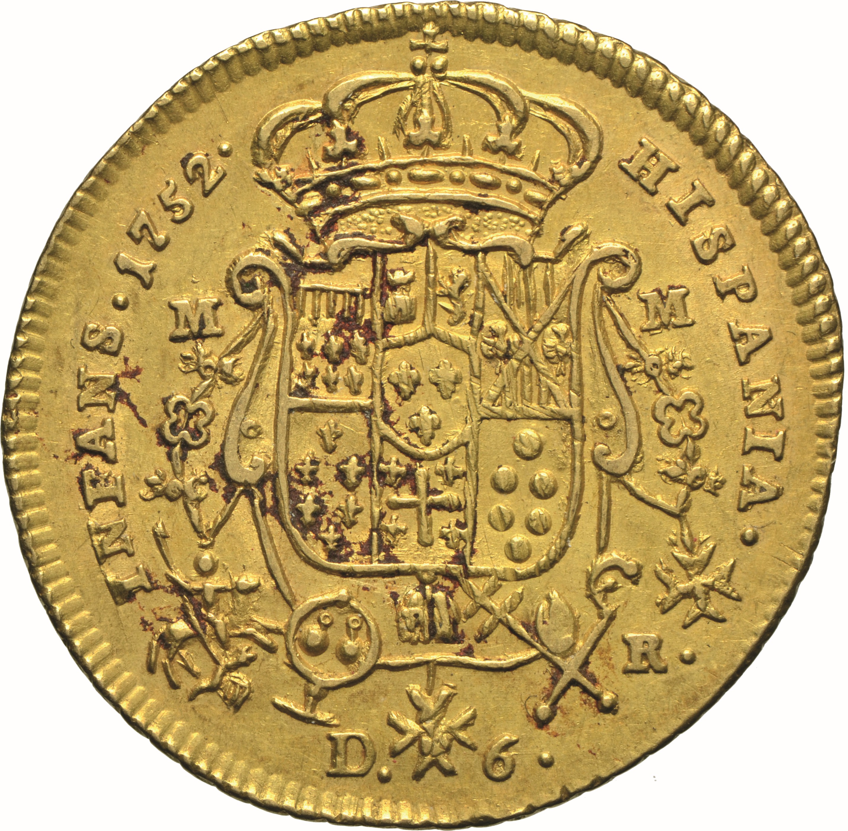 Dritto: Busto drappeggiato del re volto a d., a testa nuda e fluente capigliatura; in basso De G∙. Campo monetale delimitato da filetto dentellato. Rovescio: Scudo coronato, in cartella da cui pendono numerosi ordini cavallereschi, troncato: nel 1°, interzato in palo di a) Farnese sormontato da lambello, b) partito di Castiglia e León, c) Sicilia; nel 2°, interzato in palo di a) Angiò, b) Gerusalemme, c) Medici. Sul tutto, nel centro, scudetto dei Borbone. Ai lati M / M; in basso a d., R·; sotto, D. / 6. Campo monetale delimitato da filetto dentellato