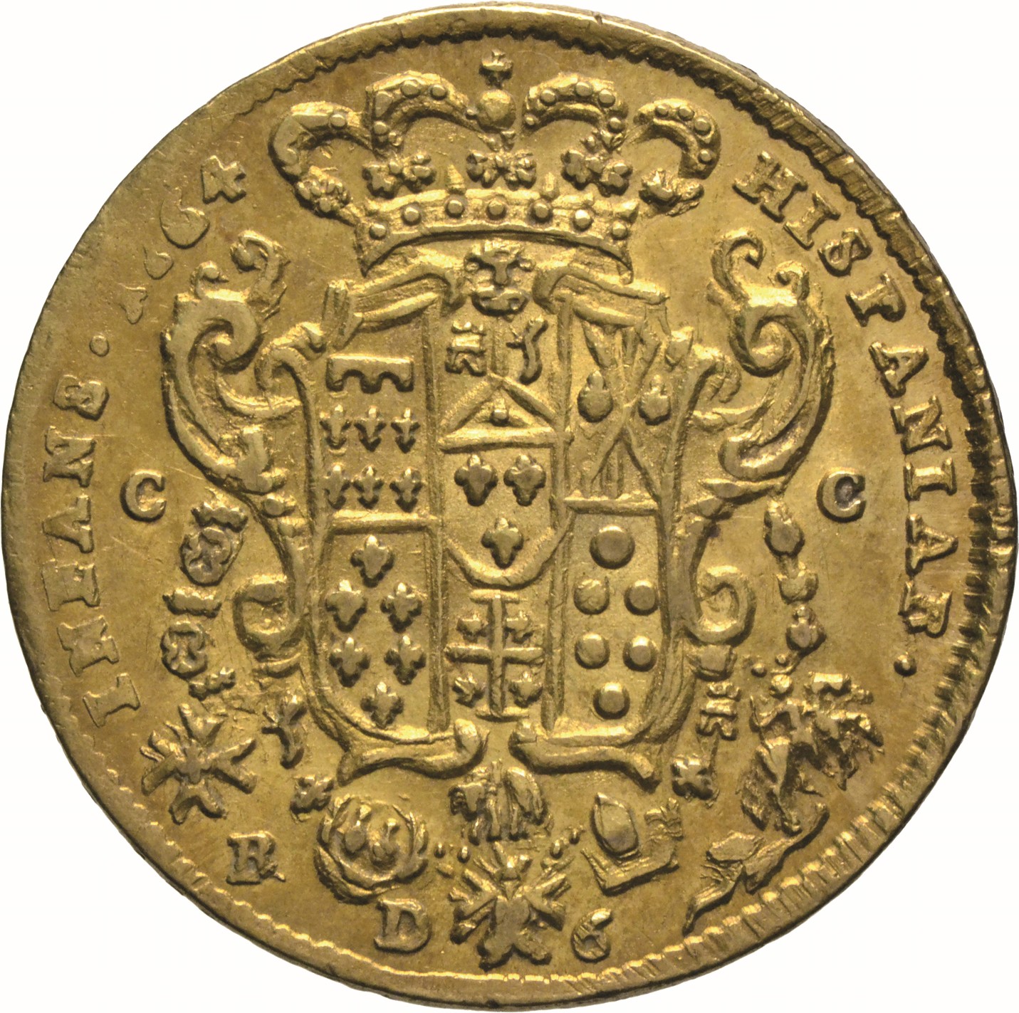 Dritto: Busto infantile del re a testa nuda volto a d., ammantato e con lunga capigliatura legata; sotto, I͜ A∙. Campo monetale delimitato da filetto dentellato. Rovescio: Scudo sagomato coronato, in cartella sormontata da mascherone e ornata da festoni, da cui pendono numerosi ordini cavallereschi, troncato: nel 1°, interzato in palo di a) Farnese, sormontato da lambello, b) interzato in pergola rovesciata, di Castiglia, León e Granada, c) Sicilia; nel 2°, interzato in palo di a) Angiò, b) Gerusalemme, c) Medici; nel centro, scudetto di Borbone. Ai lati C / C; in basso a s., R; sotto lo scudo, D / 6. Campo monetale delimitato da filetto dentellato