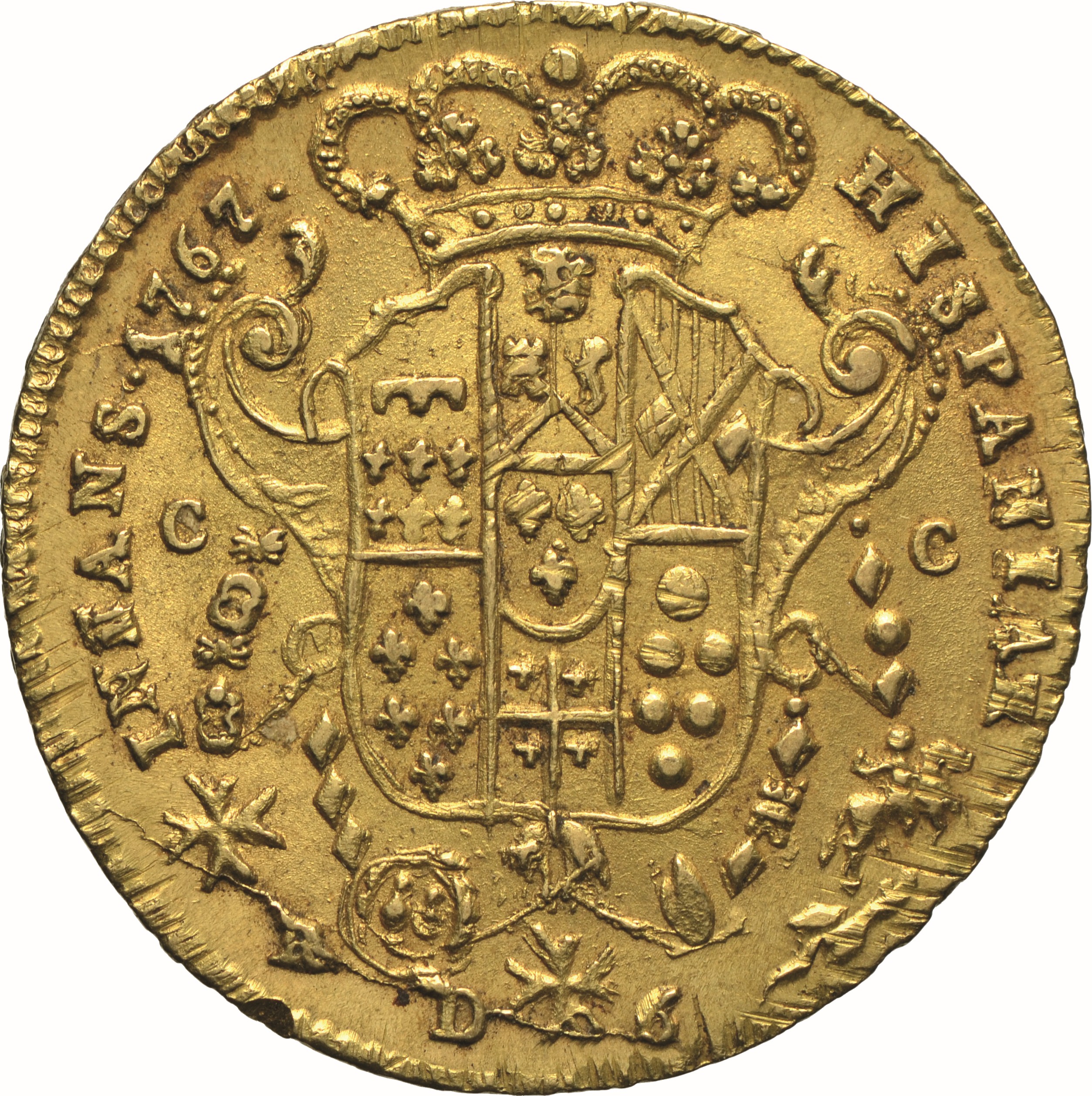 Dritto: Busto infantile del re a testa nuda volto a d., ammantato e con lunga capigliatura legata; sotto, De G. . Campo monetale delimitato da filetto dentellato. Rovescio: Scudo sagomato coronato, in cartella sormontata da mascherone e ornata da festoni, da cui pendono numerosi ordini cavallereschi, troncato: nel 1°, interzato in palo di a) Farnese, sormontato da lambello, b) interzato in pergola rovesciata, di Castiglia, León e Granada, c) Sicilia; nel 2°, interzato in palo di a) Angiò, b) Gerusalemme, c) Medici; nel centro, scudetto di Borbone. Ai lati C / C; in basso a s., R; sotto lo stemma, D / 6. Campo monetale delimitato da filetto dentellato