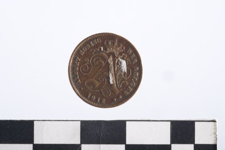 Dritto: Leone accovacciato, appoggiato ad una lastra, a d. Rovescio: Corona con monogramma di Alberto I