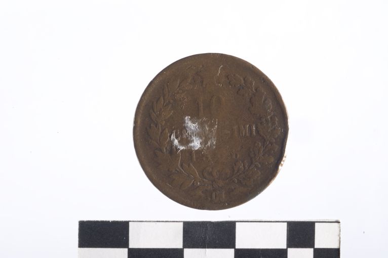Dritto: Testa di Vittorio Emanuele II, a s. Rovescio: Rami di quercia e alloro legati; in alto stellone