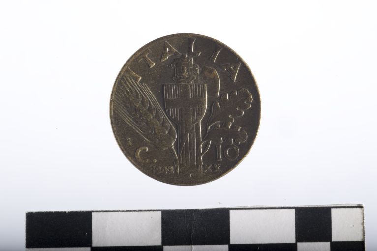 Dritto: Testa di Vittorio Emanuele III, a s. Rovescio: Fascio littorio, con stemma sabaudo sovrastante; spiga, a s.; foglie di quercia, a d