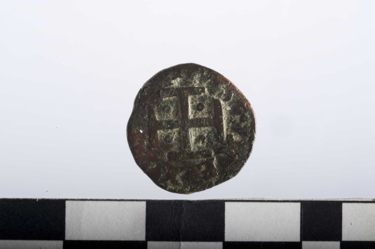 Dritto: Coolonne d'Ercole, fiore centrale, due globetti laterali. Rovescio: Croce patente, quattro globetti