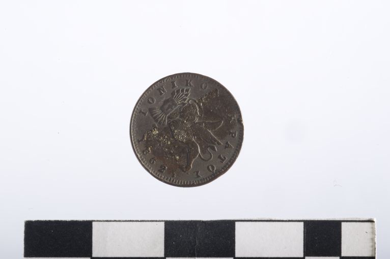 Dritto: Figura femminile allegorica seduta con scudo e tridente a d.; lungo il bordo in alto: legenda. Rovescio: Leone alato a s.; nel campo a s.: fascio di frecce (?); lungo il bordo: legenda e data