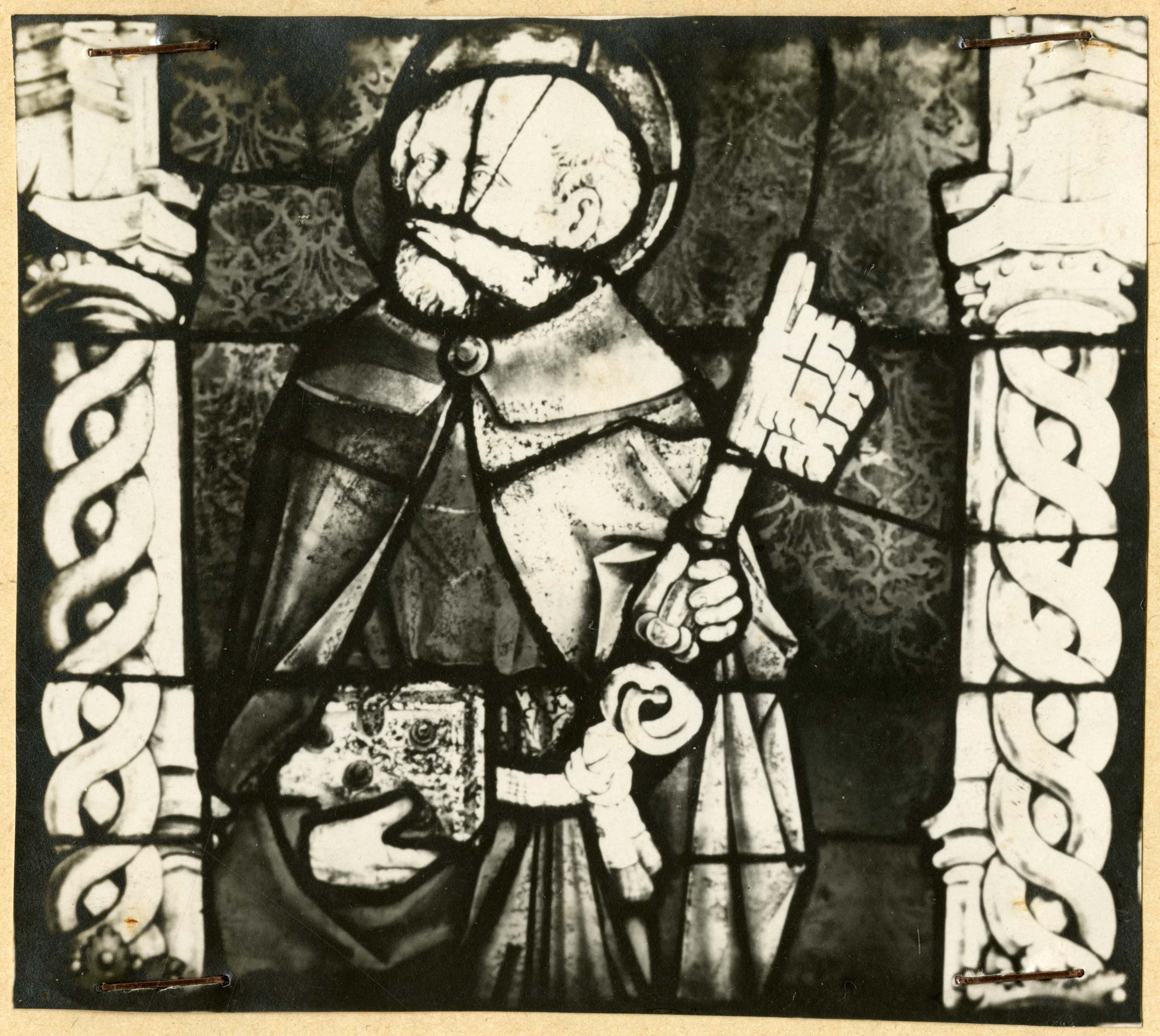 Aosta (AO) / Chiesa collegiata di S. Orso = vetrata = dopo il restauro/ vetrata di San Pietro AO - Aosta - Collegiata dei Santi Pietro e Orso - abside - lato nord: San Pietro, particolare della parte centrale con la figura del santo, vista della vetrata dopo il restauro
