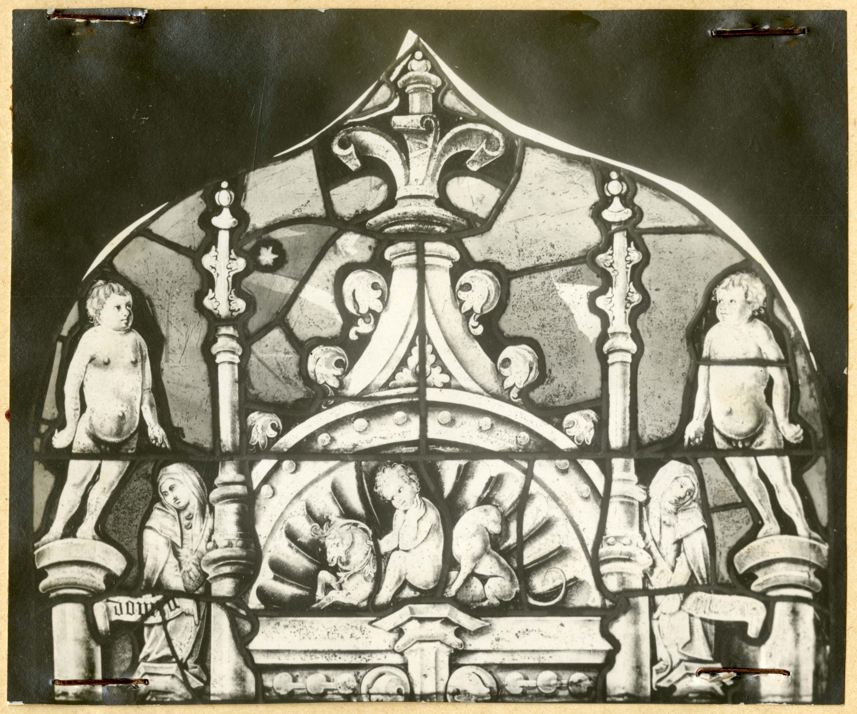 Aosta (AO) / Chiesa collegiata di S. Orso = vetrata = dopo il restauro/ vetrata di San Pietro AO - Aosta - Collegiata dei Santi Pietro e Orso - abside - lato nord: San Pietro, particolare della parte superiore cuspidata, vista della vetrata dopo il restauro