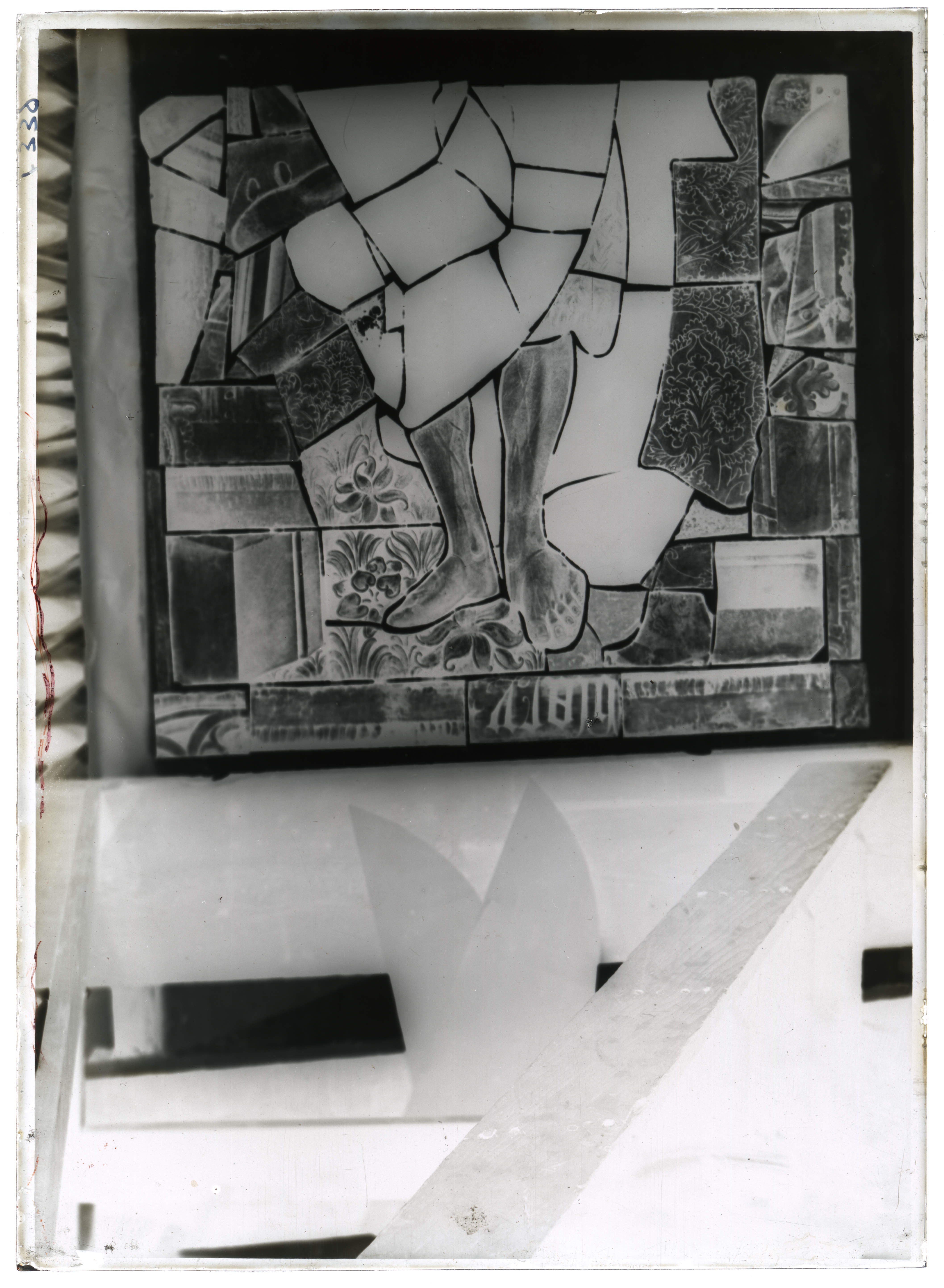 Aosta (AO)/ Chiesa collegiata di S. Orso= vetrata= part.re = prima del restauro AO - Aosta - Collegiata dei Santi Pietro e Orso - abside - lato sud: San Giovanni Battista, particolare della parte inferiore della figura del santo, vista della vetrata ricomposta, prima del restauro