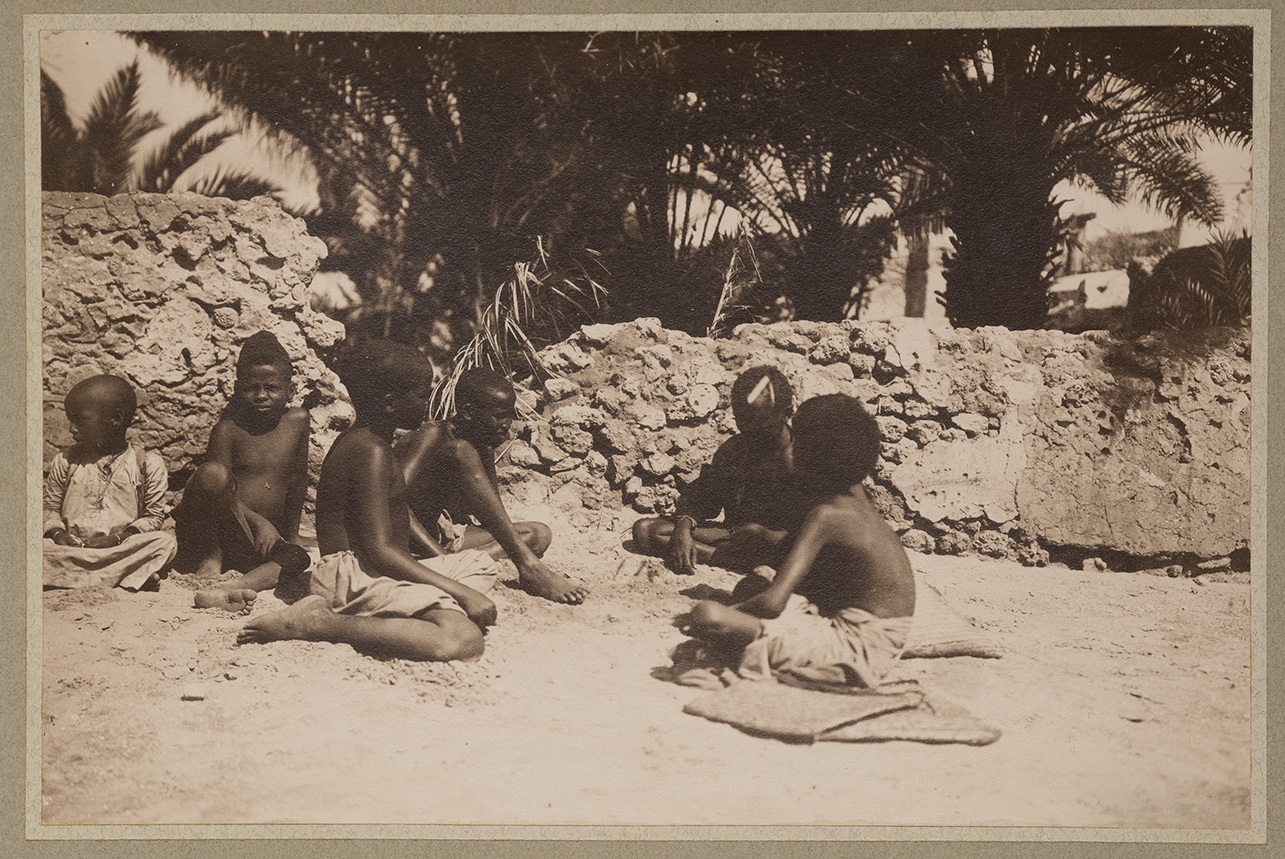 L'immagine ritrae sei bambini somali seduti mentre giocano con un mucchietto di sabbia. Tutti tranne uno portano una lunga tunica bianca, avvolta alla vita, che lascia scoperto il busto. Sulla sinistra, invece, un ragazzo indossa un lungo vestito di colore chiaro che lo copre dal collo ai piedi. In primo piano uno dei giovani osserva la camera mentre un altro, con la testa china, lascia intravedere due cerotti posti sul capo