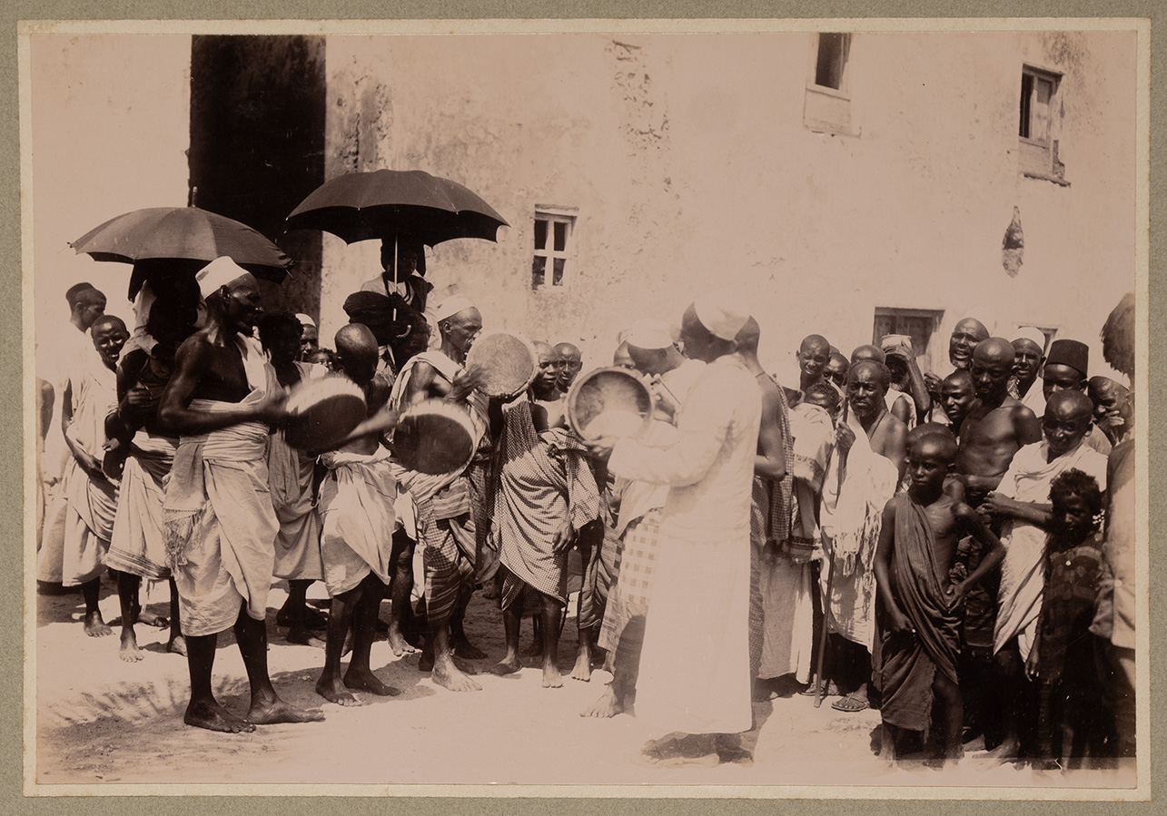 L'immagine ritrae un gruppo di quattro uomini intento a suonare un tamburo in occasione di una delle feste che si tiene presso la città di Merca (Marka). In secondo piano, si possono osservare bambini, ragazzi e anziani che osservano la danza. Sono vestiti con abiti bianchi monospalla, che lasciano scoperti solo i piedi e che non permettono, se non in rari casi, di scorgere il busto. Due dei soggetti raffigurati utilizzano un ombrello per coprirsi. Sullo sfondo, costruzioni in pietra bianca