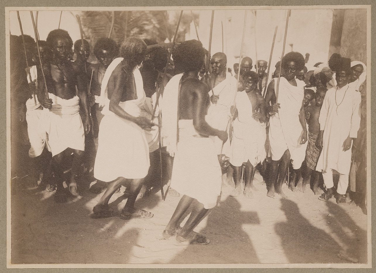 L'immagine ritrae un gruppo di uomini somali, vestiti con una lunga tunica bianca monospalla che copre loro il busto fino ai piedi oppure con una gonna che lascia intravedere la parte superiore del busto, intenti a danzare, mentre tengono in mano una lunga lancia di legno, in cerchio. Sulla sinistra, un giovane ascaro con fez e un lungo abito bianco ricamato. Tutti portano dei sandali