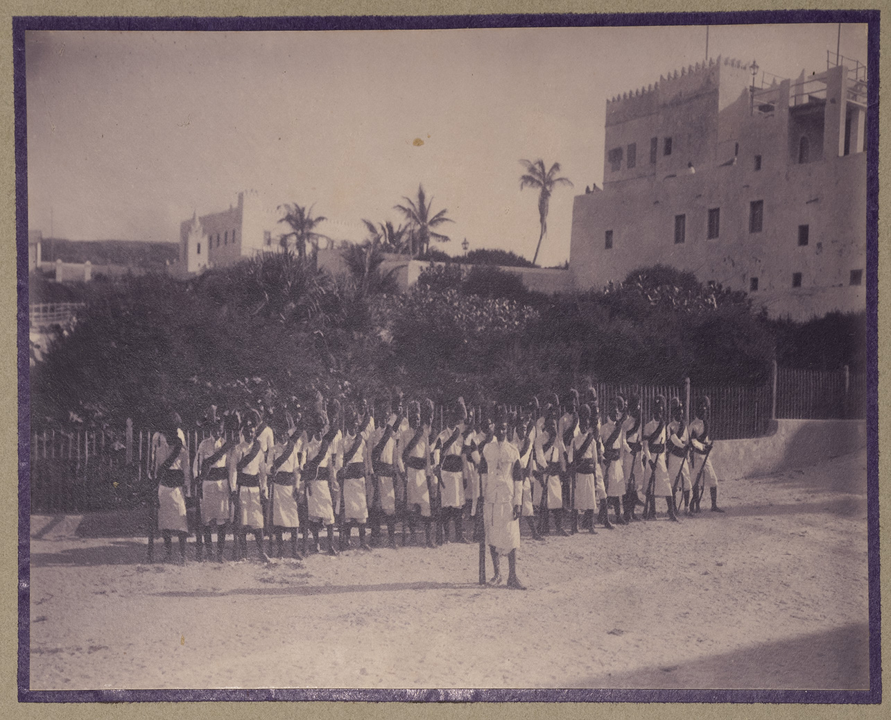 L'immagine ritrae un gruppo di ascari in divisa. Posizionati in fila su una riga, vengono preceduti da un uomo somalo con in mano in fucile, anch'egli con lo sguardo fisso in camera. In secondo piano, un palmento e alcune costruzioni in muratura bianca