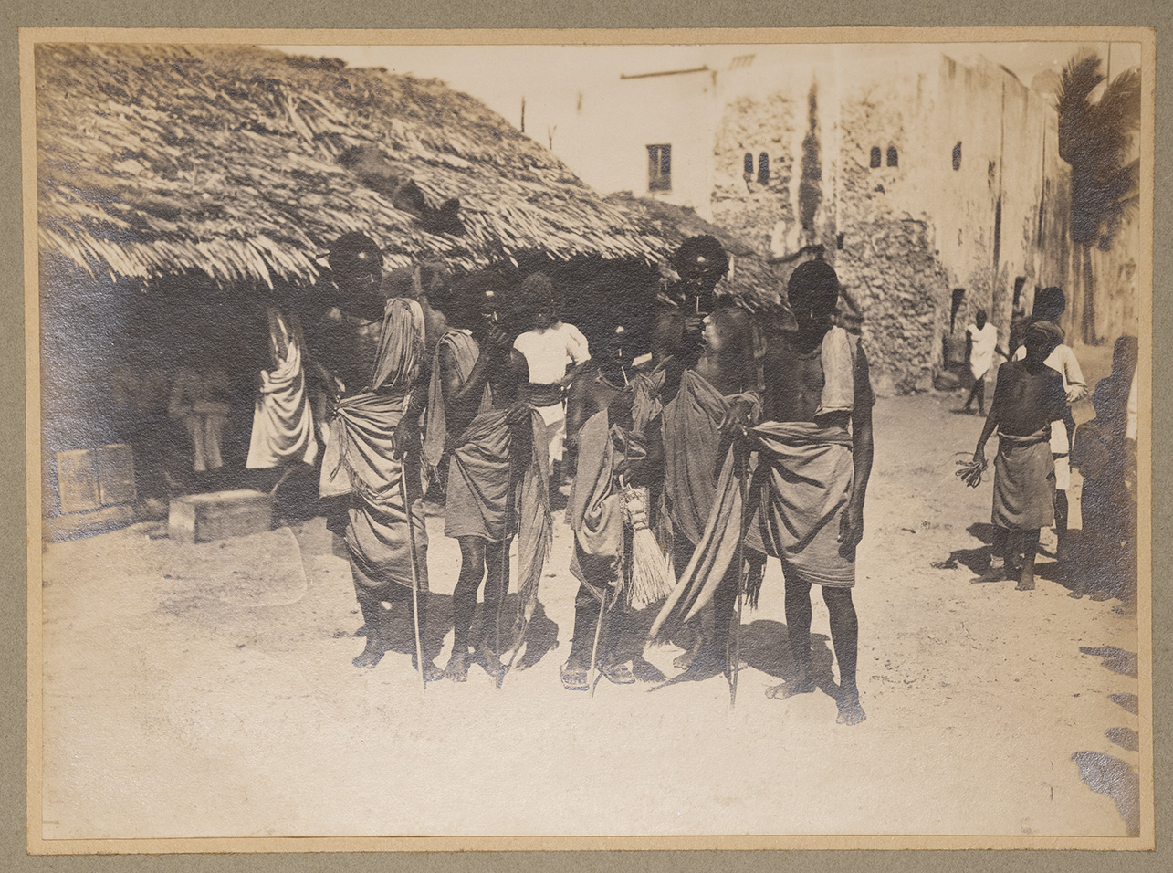 L'immagine ritrae un gruppo di cinque ragazzi somali in posa presso una delle vie della città di Merca. Vestiti con lunghe tuniche chiare, una delle quali monospalla mentre altre abbassate fino alla vita così da lasciare scoperto il busto, tengono in mano un corto bastone di legno, che utilizzano per sorreggersi. In secondo piano è possibile osservare diversi uomini intenti a lavorare e un ascaro in divisa. Sullo sfondo, alcune abitazioni in legno e paglia e altre in muratura