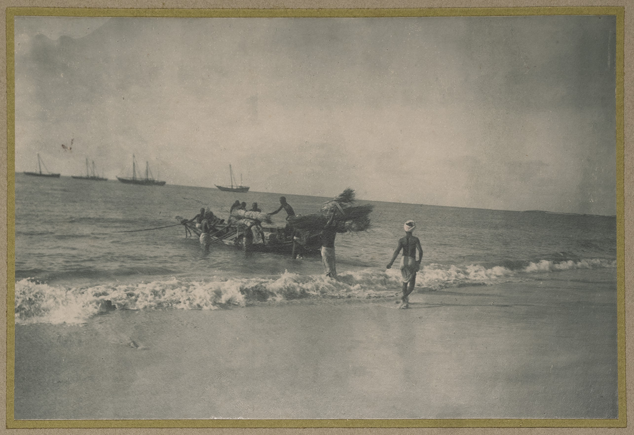 L'immagine ritrae un gruppo di uomini somali intento a sbarcare le merci contenute in un sambuco ormeggiato sulle coste della città di Merca (Marka). Tutti gli uomini vestono con una lunga tunica bianca che lascia scoperta la parte superiore del corpo, coprendo invece dalla vita fino ai piedi. In primo piano è presente un ragazzo con un turbante chiaro sul capo, mentre sullo sfondo si possono intravedere alcune imbarcazioni
