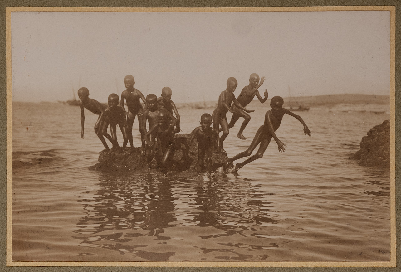 L'immagine ritrae un gruppo di bambini somali nudi che si buttano in mare da una piccola scogliera. Molti di loro indirizzano lo sguardo verso il fotografo