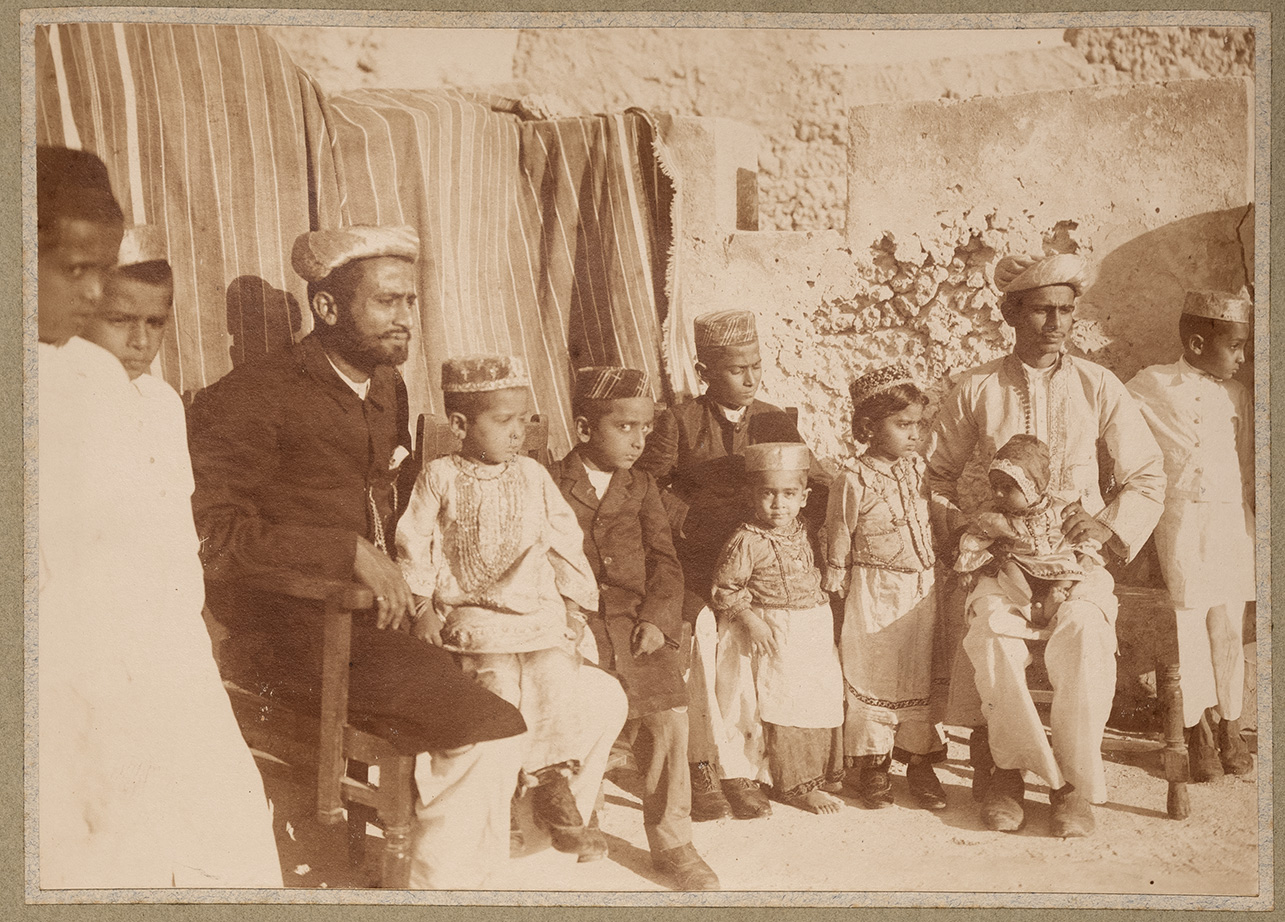 L'immagine ritrae due uomini, seduti su sedie in legno, circondati da un gruppo di nove bambini con lo sguardo fisso in camera. In secondo piano si osserva un grande telo a righe che funge da sfondo per il set fotografico