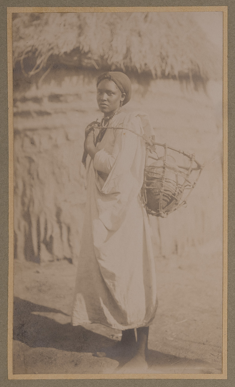 L'immagine ritrae una donna somala in posa con un lungo abito bianco che le arriva fino alle caviglie. Porta sulle spalle, tenendolo con le mani, un recipiente. Il capo è coperto da un turbante di colore scuro. Sullo sfondo, una costruzione in legno e paglia