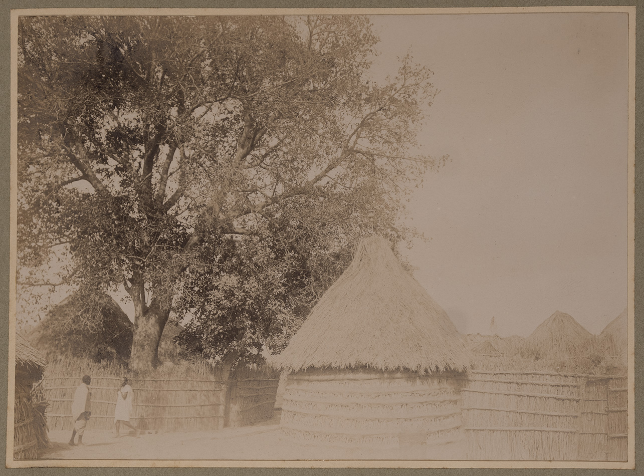 L'immagine ritrae una costruzione fabbricata con legno e paglia dalla pianta circolare nei pressi di Caitoi. Sulla sinistra sono presenti due uomini somali intenti a parlare. Vestiti con lunghe tuniche bianche, tengono con le mani lunghi bastoni. Sullo sfondo, la boscaglia somala