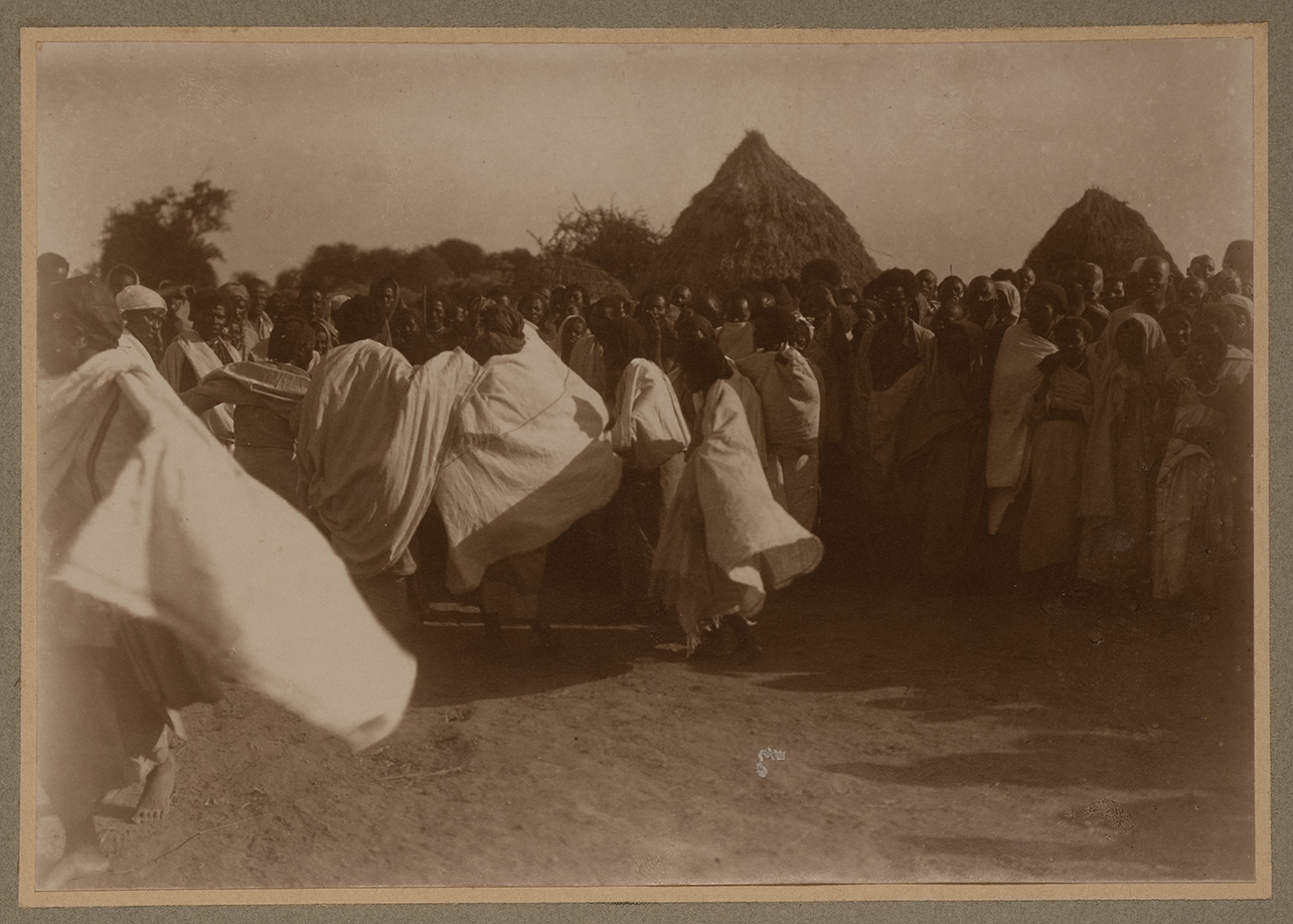 L'immagine ritrae un gruppo di donne somale intento a danzare con lunghi vestiti bianchi nei pressi di Bulomererta (Buulo Mareer). Sullo sfondo, un gruppo di locali che osserva la scena