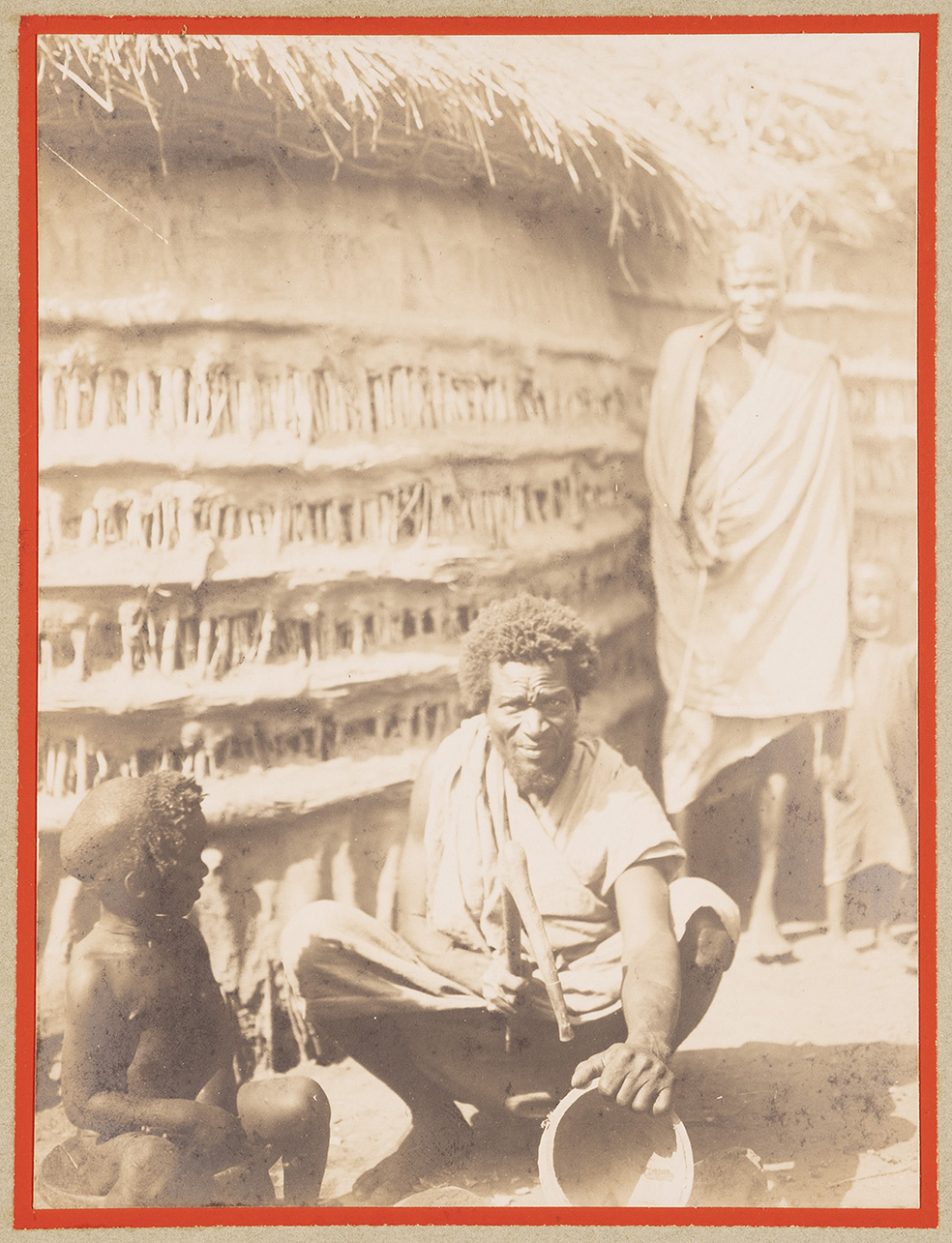 L'immagine ritrae un uomo somalo, accovacciato a terra intento a intagliare un vaso in legno, un bambino e un anziano davanti ad una costruzione in legno. Il soggetto in primo piano veste con una tunica bianca che gli copre le spalle, il petto e le gambe fino alle caviglie. Inoltre, volge lo sguardo in camera. In secondo piano, invece, è presente un altro uomo, anch'egli vestito con abiti tradizionali. Sullo sfondo, il muro di una capanna, costruito in legno e paglia