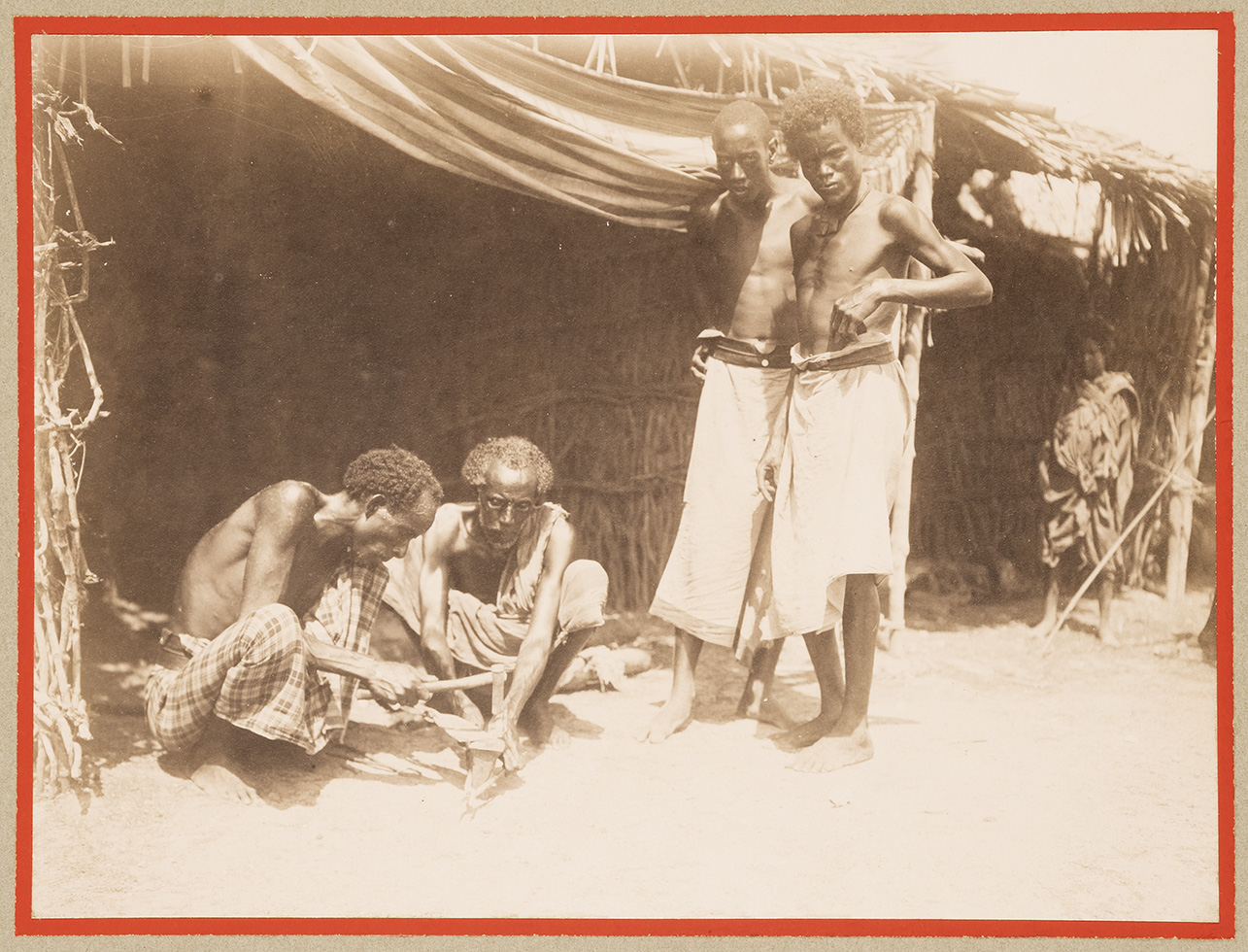 L'immagine ritrae quattro uomini somali in posa nei pressi del comprensorio agricolo di Bulomererta (Buulo Mareer). Al centro sono presenti due anziani, uno vestito con una tunica bianca monospalla e l'altro con una gonna a quadri, battono del ferro seduti a terra. Ad osservarli due giovani, entrambi con lo sguardo rivolto in camera. In secondo piano si può osservare una giovane donna somala. I soggetti fotografati sono ritratti sotto una tettoia costruita con legno e paglia