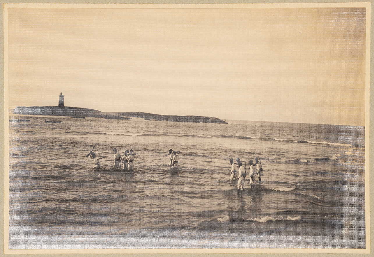 L'immagine ritrae un gruppo di ascari in divisa, con in mano un pugnale, intenti a camminare sulla riva di una spiaggia posta nelle vicinanze di Brava (Baarawe). Sullo sfondo si può osservare un faro