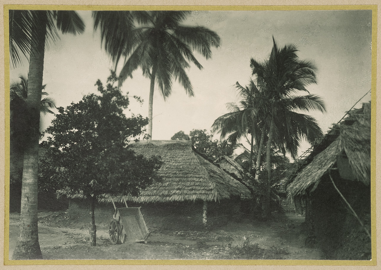 L'immagine ritrae una costruzione in paglia e legna a pianta rettangolare accanto alla quale è presente una cariola e altre abitazioni della stessa forma e materiali. Sullo sfondo, un palmeto