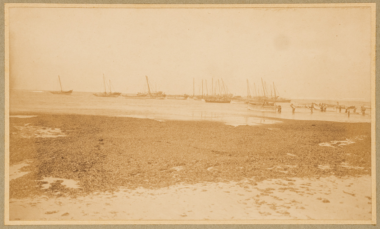 L'immagine ritrae un gruppo di sambuchi ormeggiati nei pressi della costa di Brava (Baarawe). Vicino alle imbarcazioni sono presenti uomini e donne intenti a caricare o scaricare merci o cibo, presenti nei sacchi in tela che tengono sulle spalle