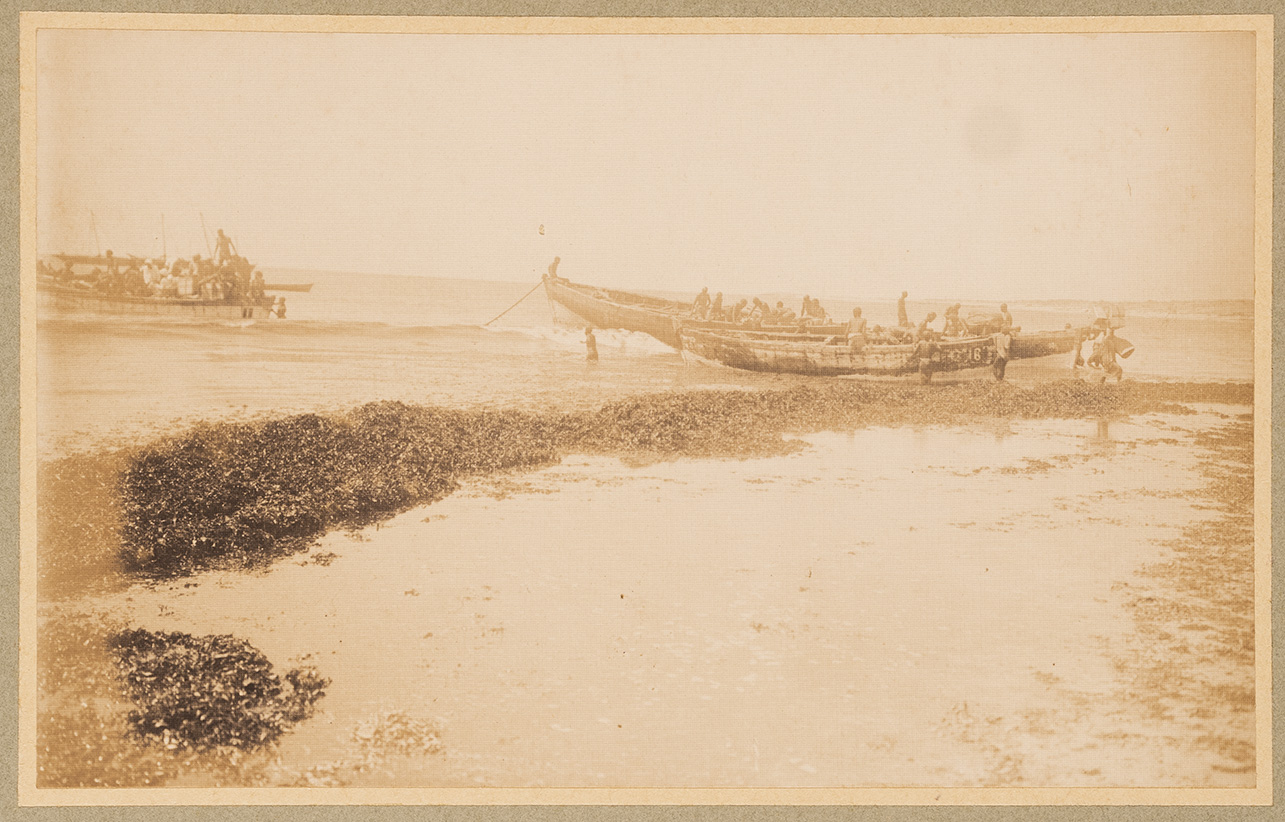L'immagine ritrae un gruppo di uomini e donne intenti a sbarcare merci e bestiame dai sambuchi ormeggiati sulla spiaggia di Brava (Baarawe)