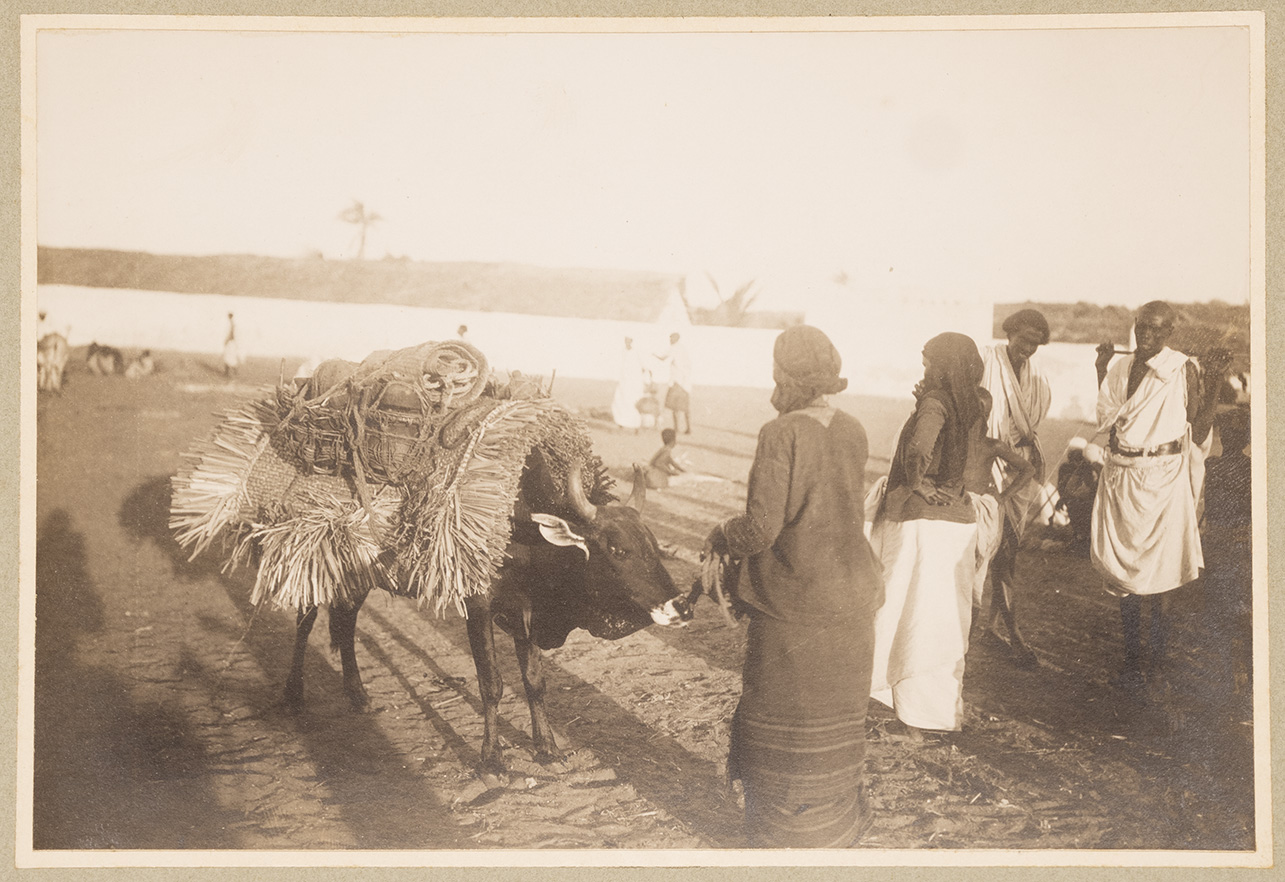 L'immagine ritrae un gruppo di uomini e donne, alcuni dei quali danno le spalle alla fotocamera, intenti a caricare su un bovino delle stuoie. Sullo sfondo, si possono osservare imbarcazioni in legno con le vele spiegate a largo delle coste di Brava (Baarawe), nonché dei pastori che guidano un gregge di mucche