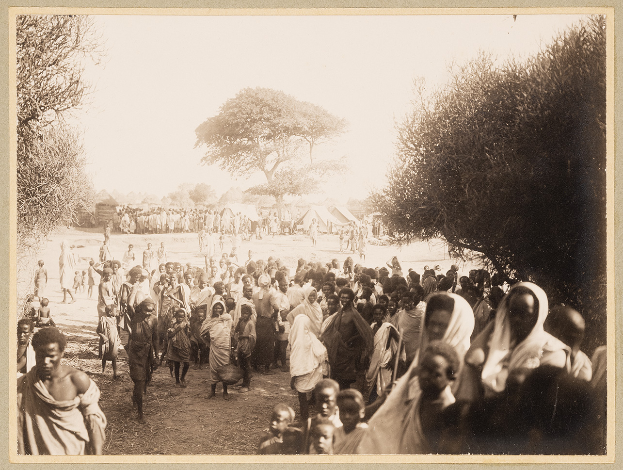 L'immagine ritrae uomini e donne - perlopiù vestiti con lunghe tuniche bianche che li coprono dalla vita in giù, lasciando scoperto il petto o parte di esso - che camminano e trasportano oggetti e casse nelle vicinanze dell’accampamento del Governatore della Somalia Italiana Giacomo De Martino. Le ragazze raffigurate portano il velo. Molti dei soggetti raffigurati volgono lo sguardo alla fotocamera. Sullo sfondo, sono presenti alcune tende, costruzioni locali in paglia e legno a pianta circolare e con il tetto spiove, nonché la boscaglia somala