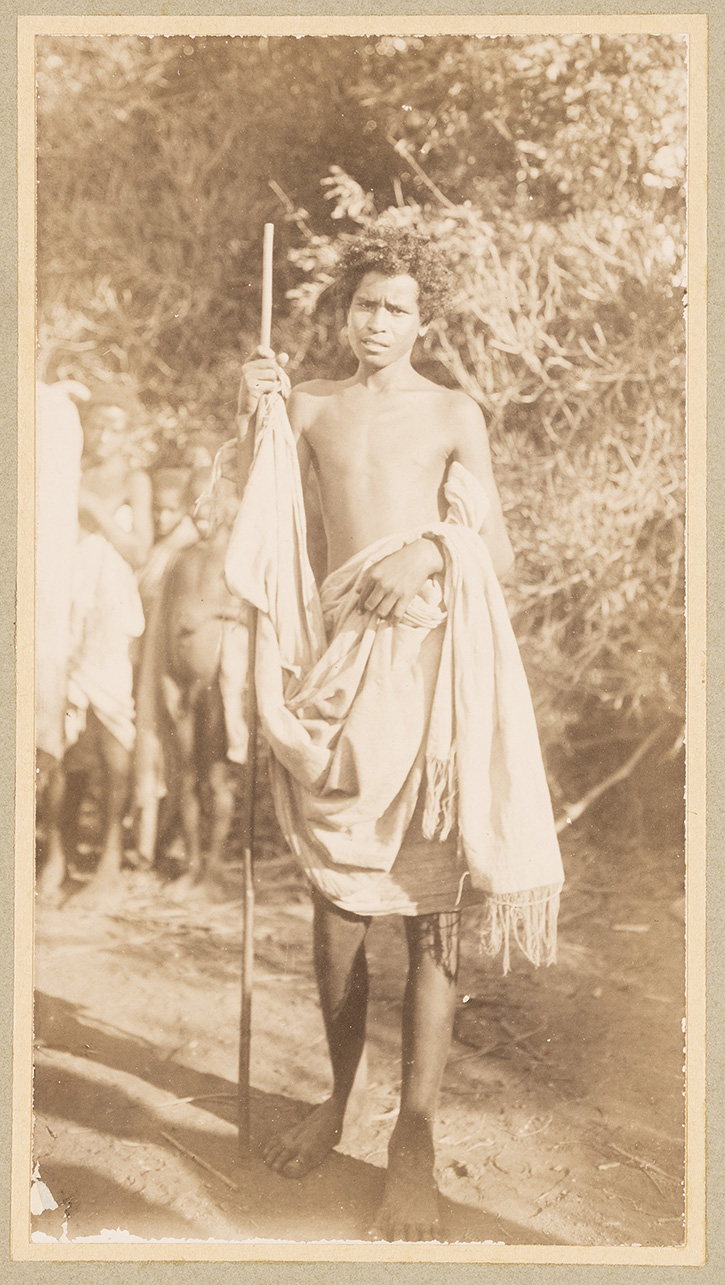 L'immagine ritrae un giovane uomo somalo in posa, che veste con una tunica bianca che lascia scoperto il petto e che non porta i sandali. Tiene, però, nella mano sinistra un lungo bastone di legno. Sullo sfondo è presente un gruppo di uomini e bambini che osservano il fotografo con un'espressione dubbiosa