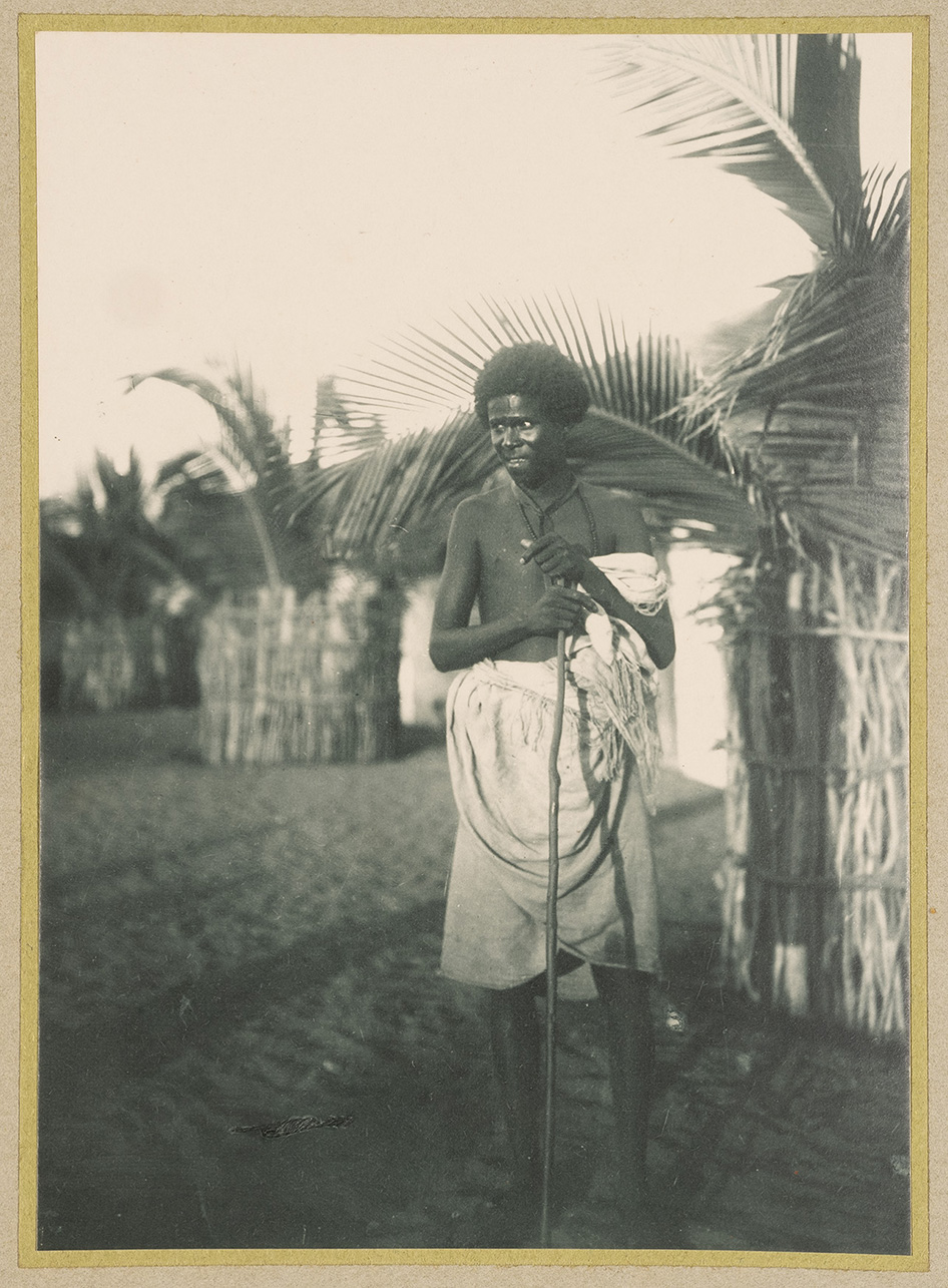 L'immagine ritrae un giovane uomo somalo in posa, che veste con una lunga tunica bianca che lascia scoperto il petto. Con le due mani tiene un corto bastone di legno. Il soggetto rappresentato volge lo sguardo da un'altra parte rispetto all'obbiettivo. Sullo sfondo si possono osservare alcune costruzioni in paglia e legno e un palmeto