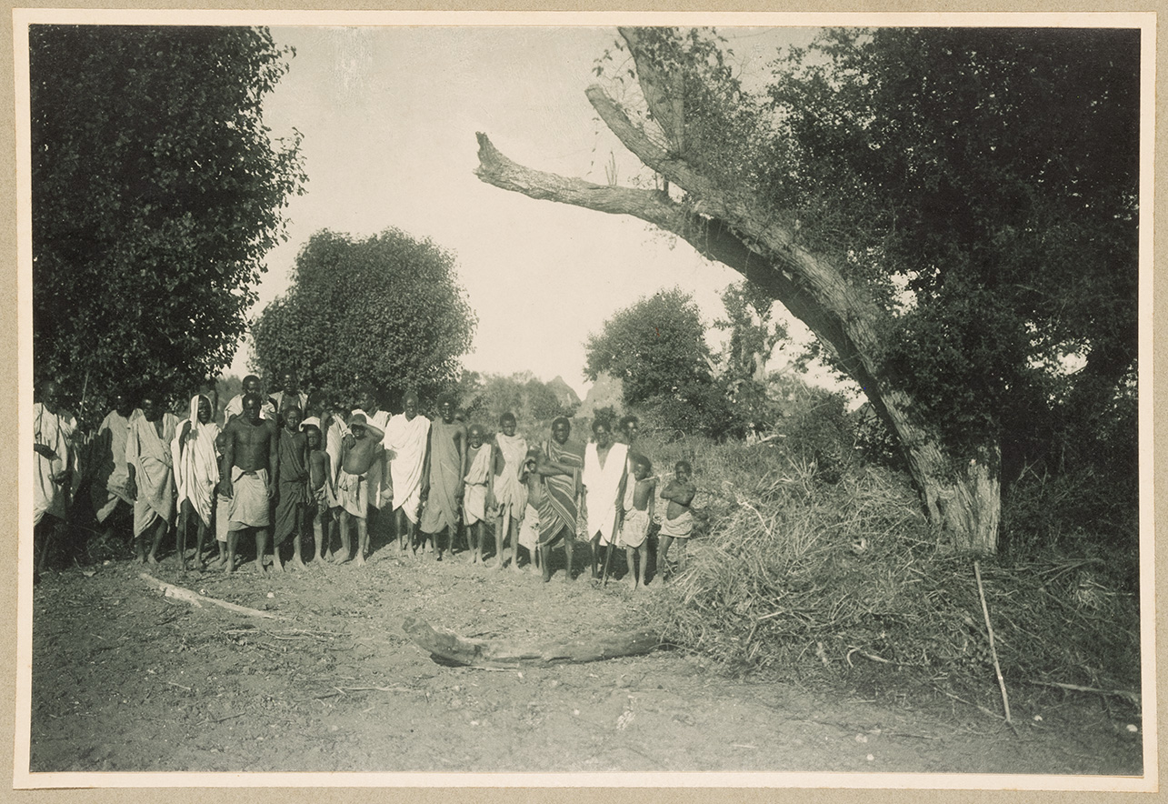 L'immagine ritrae un gruppo di uomini, donne e bambini in posa, molti dei quali tengono nella mano sinistra un lungo bastone di legno. Sullo sfondo, la boscaglia
