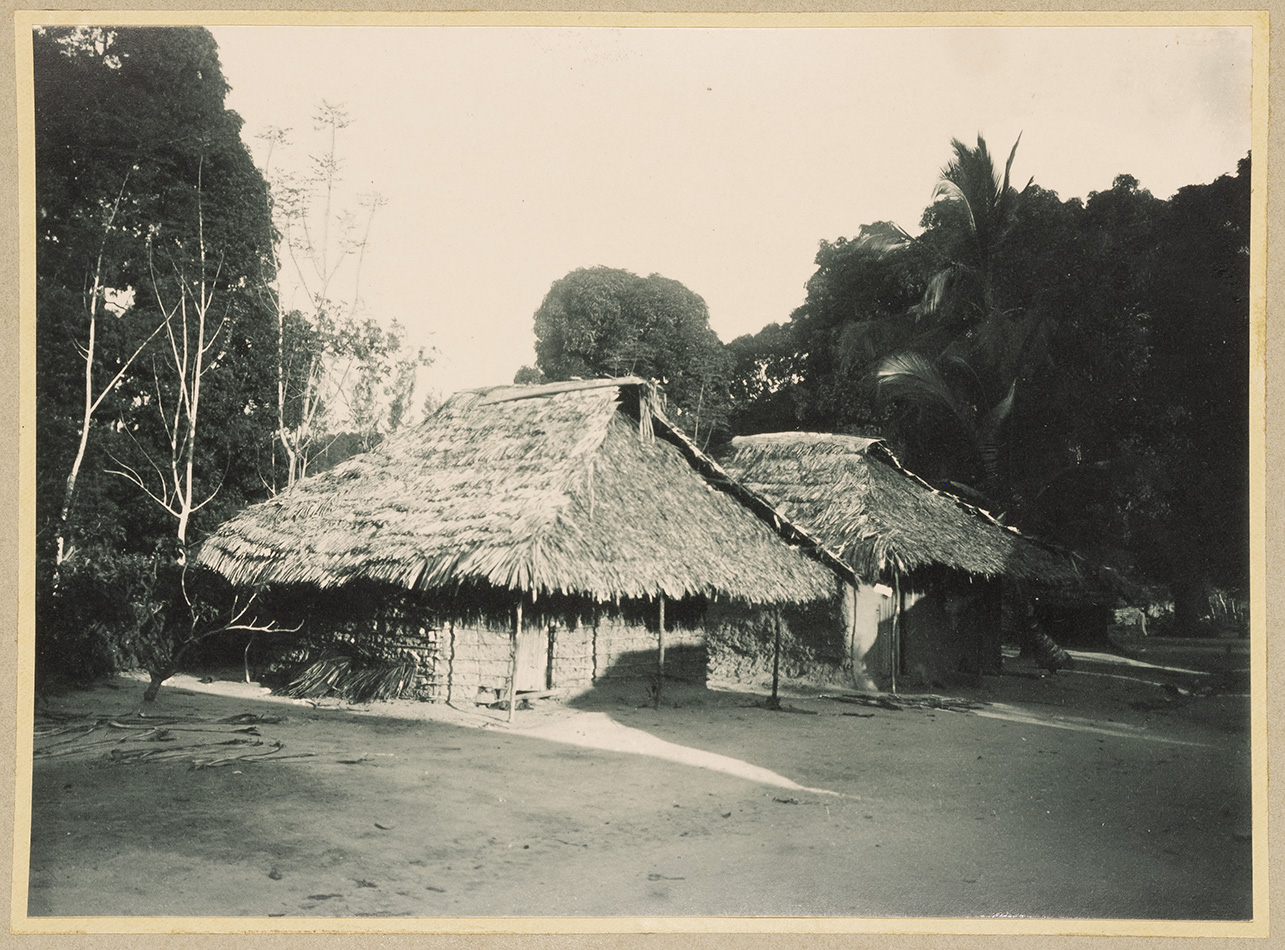 L'immagine ritrae due strutture in paglia e legno a pianta rettangolare. Sullo sfondo, la boscaglia somala