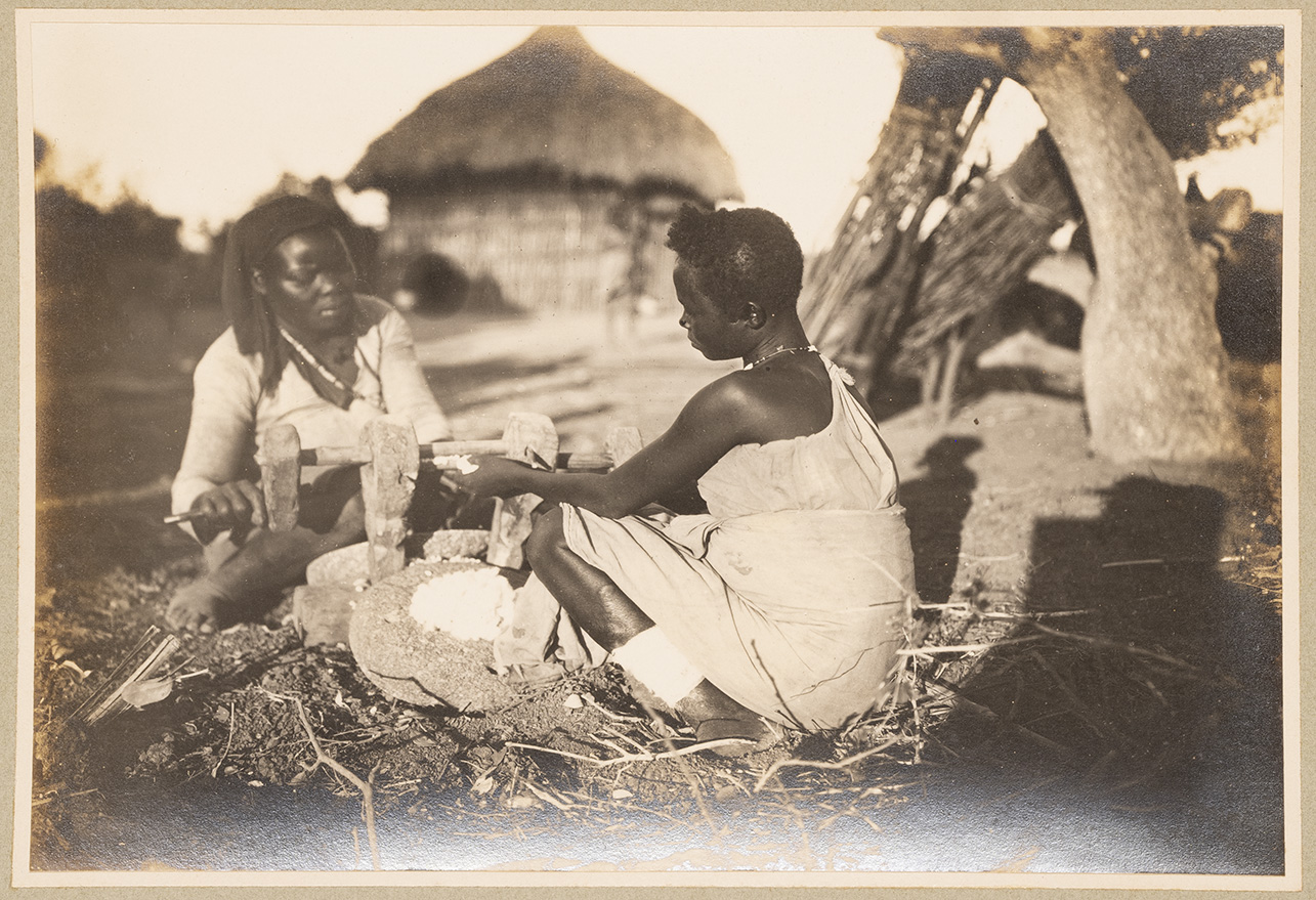 L'immagine ritrae due donne somale sedute a terra intente a sgranare il cotone. Sullo sfondo è presente una costruzione di legno e paglia a pianta circolare