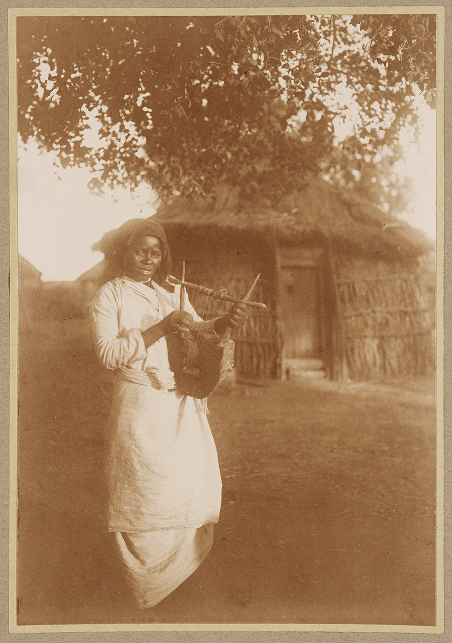 L'immagine ritrae una giovane suonatrice in posa. La donna, che veste con un lungo abito bianco di fattezze occidentali, tiene in mano un'arpa, fabbricata con legno e corde. Sullo sfondo è possibile osservare una costruzione in legno e paglia a pianta circolare, nonché la boscaglia