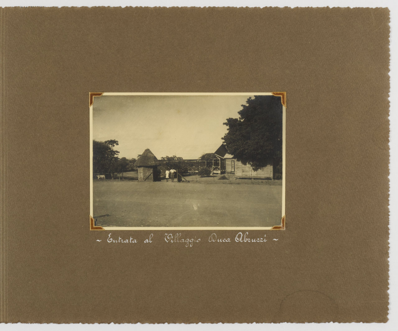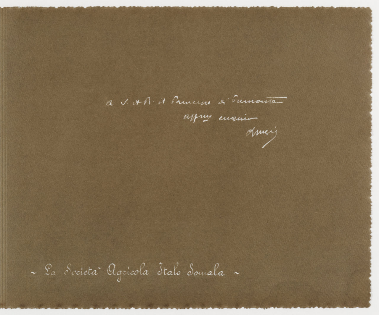 Album con coperta in cartone foderato in pelle marrone finto coccodrillo, con nastrino in cuoio passante ai bordi; legatura orientale con cordoncino. Fogli in cartoncino color tabacco; al frontespizio dedica autografa di Luigi Amedeo di Savoia Duca degli Abruzzi / La Società Agricola Italo Somala a tempera bianca, così come le didascalie delle stampe fotografiche, fissate al supporto con angolini adesivi in carta