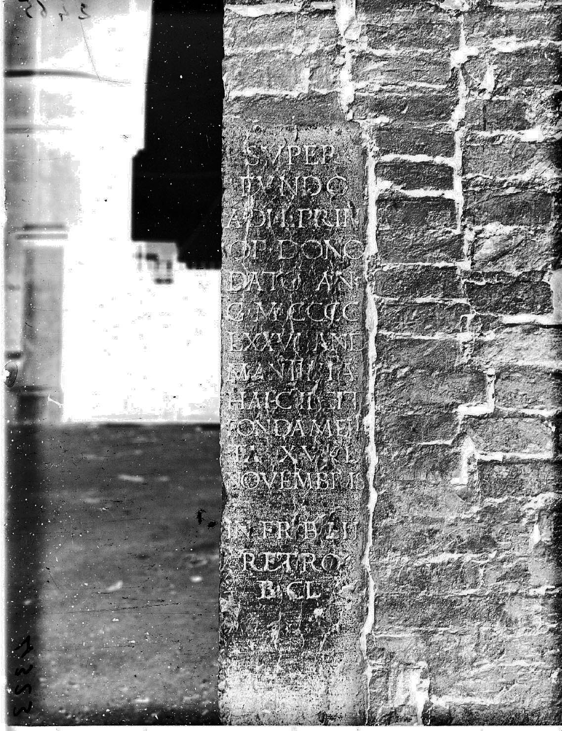 Casa del Mantegna, angolo esterno verso San Sebastiano, epigrafe marmorea commemorativa della fondazione della Casa (1476), durante i restauri
