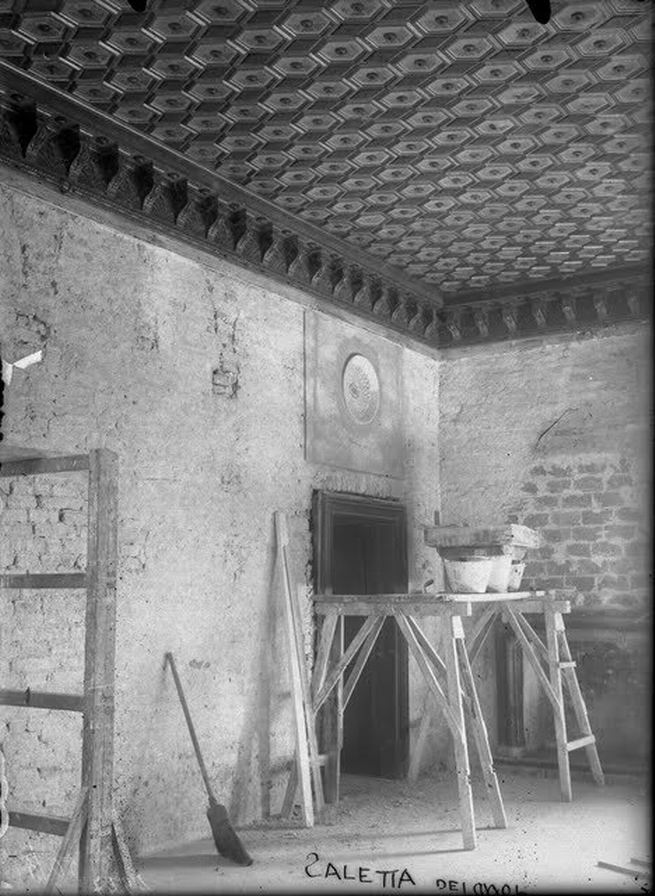 - NOTIZIE STORICO CRITICHE Lo scatto in esame è forse da ascriversi alla fase di restauro che ha interessato la decorazione delle stanze dell'Appartamento del Paradiso. Il soffitto della Saletta delle Piastrelle fu reintegrato con poche rosette mancanti e alcune cornici. L'immagine in esame presenta ancora il cantiere aperto, con le pareti prive di intonaco e attrezzature di restauro. Una immagine successiva all'intervento è pubblicata in Clinio Cottafavi, Gli appartamenti di Eleonora Medici, del Paradiso e dei Nani, Bollettino d'Arte, Serie III, Settembre 1934, pp. 128-139, fig. 9