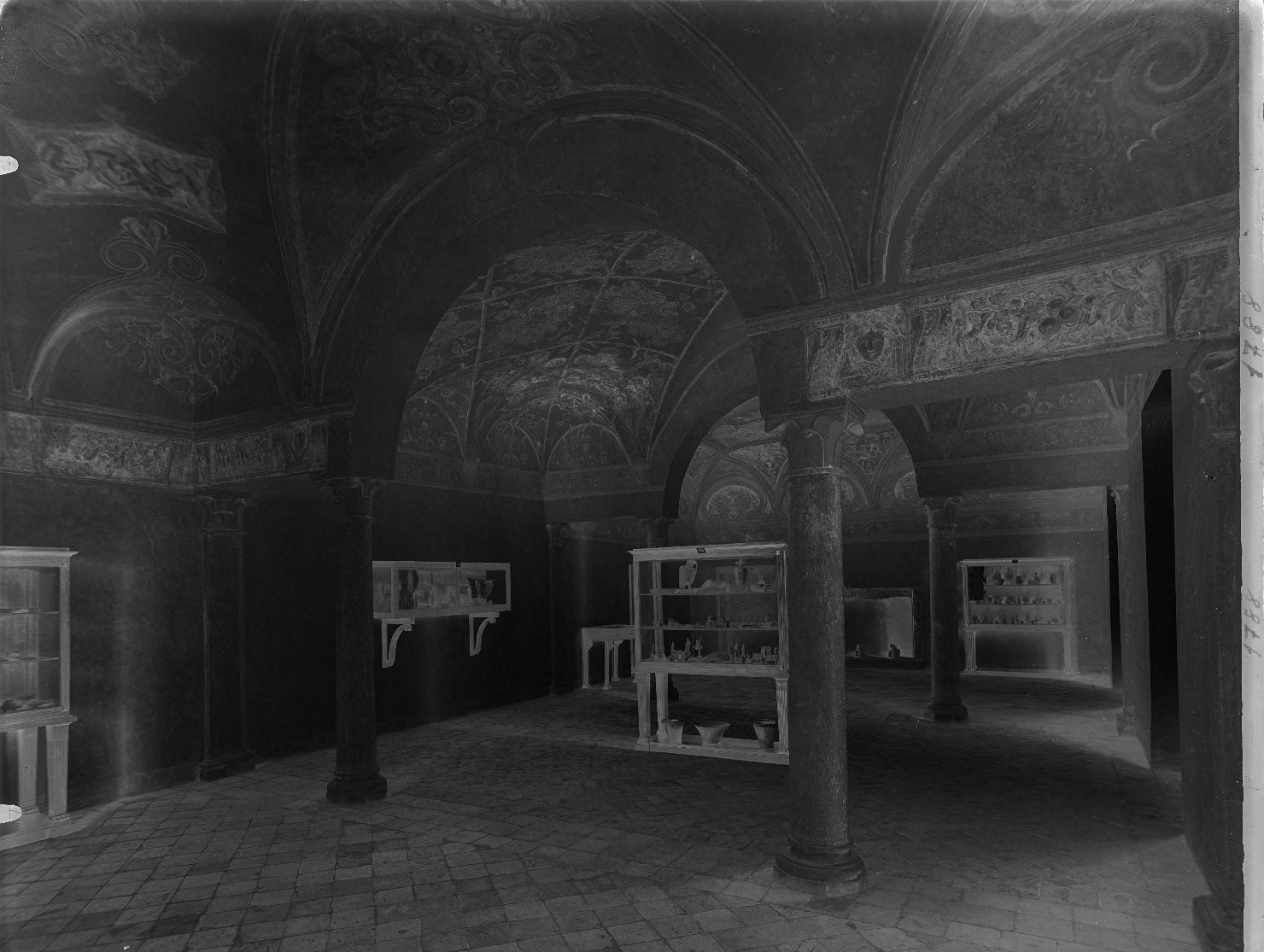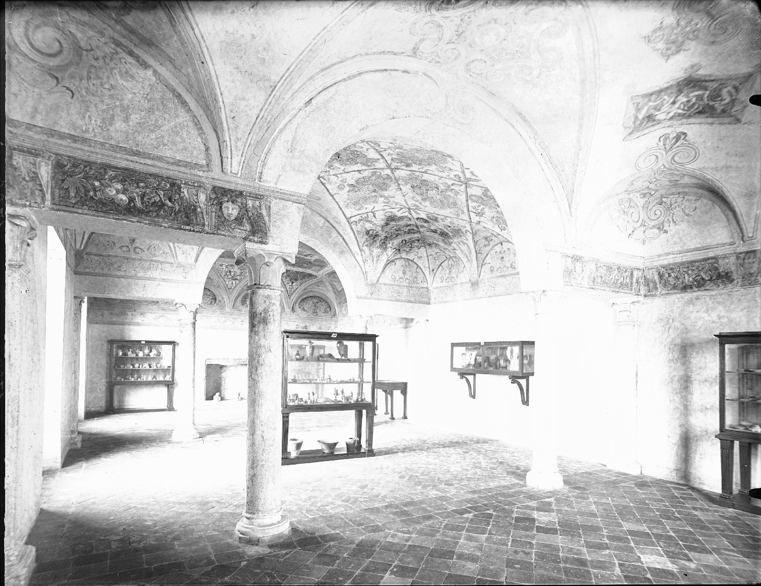 - NOTIZIE STORICO CRITICHE La lastra documenta la sala delle Quattro Colonne dopo i restauri diretti da Cottafavi nel 1926. Un'immagine analoga di tale sala è pubblicata in Clinio Cottafavi, Cronaca delle Belle Arti. Direzione delle antichità e belle arti in Bollettino d'Arte, Serie III, Settembre 1926, pp. 136-142, fig. 1: in questa immagine della sala gli arredi presenti sono diversi (mancano alcune teche), e si può supporre che la lastra sia successiva rispetto all'immagine pubblicata, che compare peraltro anche in Nino Giannantoni, Il Palazzo Ducale di Mantova, Roma, La Libreria dello Stato, 1929, fig. a p. 81, "Sala delle Quattro Colonne - Soffitti fine secolo XVI". Giannantoni precisa qui che in tale sala "sarà sistemato il reparto etrusco-romano del Museo archeologico" (p. 82)