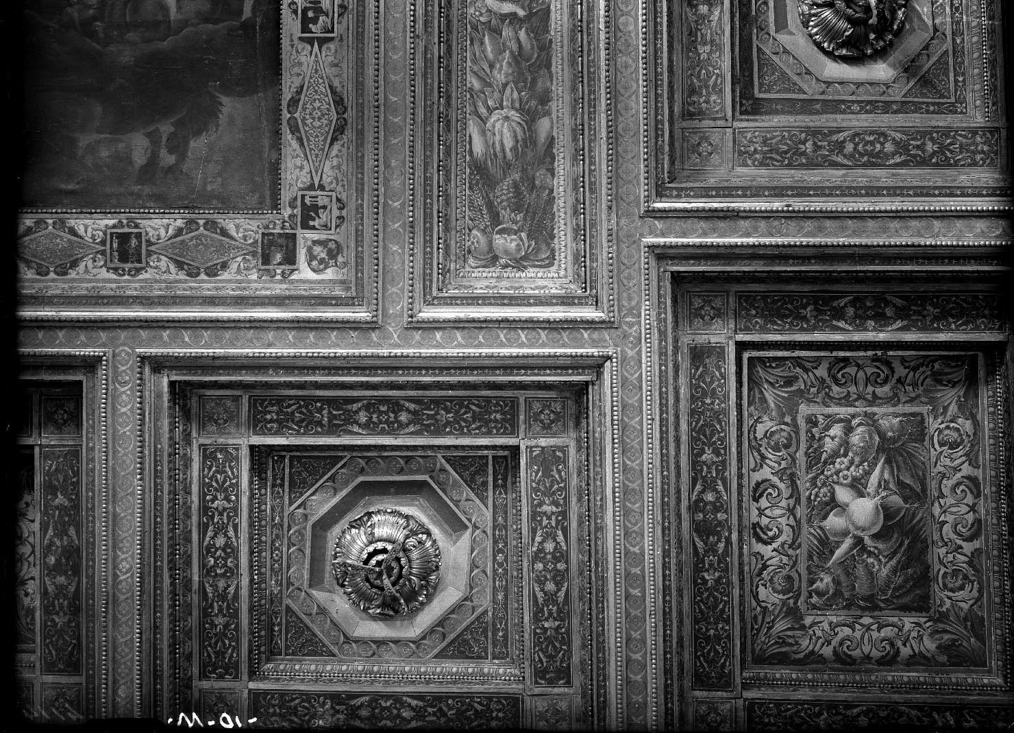 - NOTIZIE STORICO CRITICHE La lastra fu pubblicata da Clinio Cottafavi sul Bollettino d'arte del dicembre 1928, a corredo della sua relazione, con la didascalia «Sala dei Cavalli: Dettaglio del soffitto dopo il restauro» (Clinio Cottafavi, R. Palazzo Ducale di Mantova. Le Sale dei cavalli e delle teste, "Bollettino d'arte del Ministero della pubblica istruzione", serie II, vol. VIII, n. 6 (dicembre), 1928, pp. 278-286: fig. 6, p. [283]). Mostra una porzione del soffitto ligneo intagliato, dipinto e dorato della Sala dei Cavalli nell'Appartamento di Troia, nella quale di intravvede parte della tela con la Caduta di Icaro dipinta da Luca di Sebastiano Scaletti, detto Luca da Faenza o il Figurino. La tela, identificata nei depositi dal Cottafavi, fu riposizionata in loco nel corso dei restauri, condotti tra 1926 e 1928 col contributo della Società per il Palazzo Ducale e della Banca agricola mantovana (Renato Berzaghi, La camera dei Cavalli, in Giulio Romano, Milano, Electa, 1989, pp. 394-395)