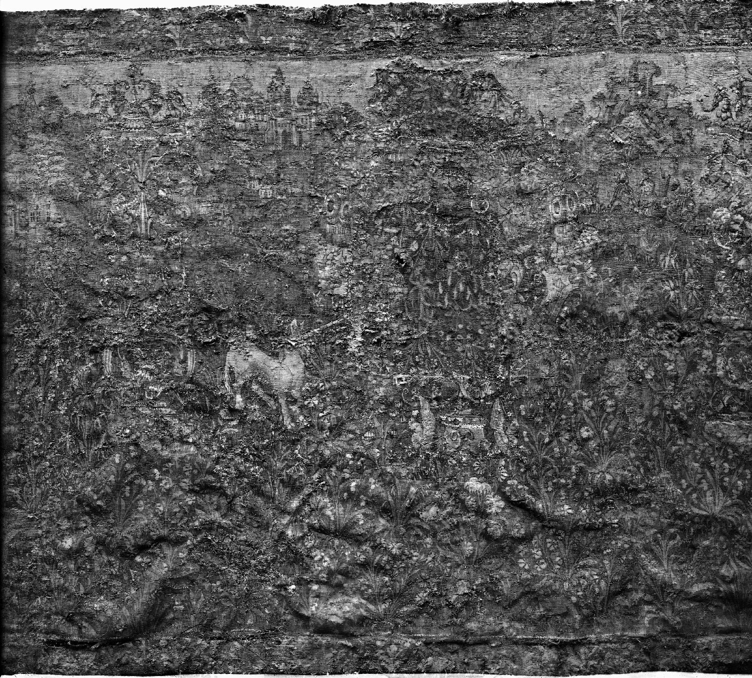 - NOTIZIE STORICO CRITICHE La lastra fotografa la porzione destra di un arazzo millefiori che compare anche nei negativi con invv. 1830 (della quale costituisce un particolare), 4042, 4040, 4025 (che lo riprendono successivamente al restauro). Tale arazzo, ricondotto alla manifattura di Bruges e datato da Delmarcel e Brown al secondo quarto del Cinquecento è ritratto presumibilmente in un esterno di Palazzo Ducale e fa parte di un gruppo di tre tessuti provenienti dalla Basilica di Santa Barbara, usati come vili tappeti sino al 1917, quando furono condotti a Palazzo Ducale (insieme ad altri manufatti tessili provenienti dal Duomo della città e dalla Parrocchiale di Pozzolo) per essere inviati a Firenze preservandoli così dai possibili bombardamenti. Rientrati nella reggia gonzaghesca al termine della I guerra mondiale, insieme agli arredi isabelliani e alle moltissime opere partite da Mantova fra 1917 e 1918, i tre arazzi furono oggetto di un progetto di restauro del quale la recente bibliografia pare non essere a conoscenza (Giuseppe Gerola, Relazione del R. Sovraintendente dei monumenti della Romagna incaricato delle operazioni di sgombero di oggetti d'arte compiute nella provincia di Mantova, "Bollettino d'arte del Ministero della pubblica istruzione", a. 12, nn. 9-12 (settembre-dicembre), 1918, pp. 270-272). Nell'archivio della Soprintendenza di Brescia si conservano due nuclei di lastre, disseminate in diversi raccoglitori, oggi ricondizionati in seguito al restauro dei materiali fotografici. Con qualche difficoltà è possibile ipotizzare la datazione degli scatti in base allo stato dei tessuti fotografati e alla documentazione archivistica relativa alle operazioni di conservazione condotte su almeno uno dei manufatti, che sono oggi conservati presso il Museo Diocesano di Mantova. Tra 1926 e 1928 si tenne un fitto scambio epistolare tra il Sovrintendente di Verona (Gino Fogolari) e l'arazziera Minna Garoglio di Firenze. Dopo il rigetto di un preventivo di spesa troppo elevato per le finanze ministeriali, nel tentativo di contenere i costi ci si rivolse alla ricamatrice Caterina d'Indri di Venezia, che iniziò, nella città lagunare, a intervenire sull'arazzo più ammalorato (forse quello con inv. 1116). Nel 1929 si completò a Firenze, grazie alla mediazione del locale Sovrintendente, la ricomposizione di questo stesso arazzo a cura della prima candidata Minna Garoglio (Soprintendenza BAP Brescia, Archivio Monumenti, b. 187: Mantova, Palazzo Ducale, Pratica generale). Al termine delle operazioni i tre arazzi trovarono dimora nell'antisala dei Duchi (Clinio Cottafavi, Mantova. Palazzo Ducale, appartamento del Tasso e sala dei Duchi, "Bollettino d'arte del Ministero della pubblica istruzione", a. 25, serie III, n. 2 (agosto), 1931, pp. 88-93: fig. 6, p. 92), mentre Paccagnini nel 1974 li ricorda nella Sala delle Aquile dell'Appartamento della Guastalla (Giovanni Paccagnini, Il Palazzo Ducale di Mantova, Milano, Electa, 1974). Pur avendo notizie archivistiche del restauro di un solo arazzo, il confronto fra i diversi scatti permette di distinguere per tutti e tre i tessuti due stati di conservazione diversi e sicuramente imputabili a un intervento di integrazione. Nel nostro caso, per il confronto con la lastra inv. 4042, ipotizziamo che lo scatto sia precedente a tale operazione e quindi databile fra il 1917, anno del transito dei tessuti da Palazzo Ducale e il 1929, anno del completamento del restauro. Per i tre arazzi si veda la recente bibliografia: Nello Forti Grazzini, I Millefiori Araldici, di Federico II (?), in Guy Delmarcel, Clifford M. Brown, Gli arazzi dei Gonzaga nel Rinascimento, Milano, Skira, 2010, pp. 50-57; Renato Berzaghi, Stefano L'Occaso, Dipinti e arazzi. 1430 - 1630, Mantova, Publi Paolini, 2011, nn. 20-22, pp. 56-60). Il confronto con la lastra con inv. 1830, scattata nel Cortile di Santa Croce del Palazzo Ducale di Mantova, permette di affermare che si tratta di un particolare della medesima ripresa e che identico ne sia il luogo