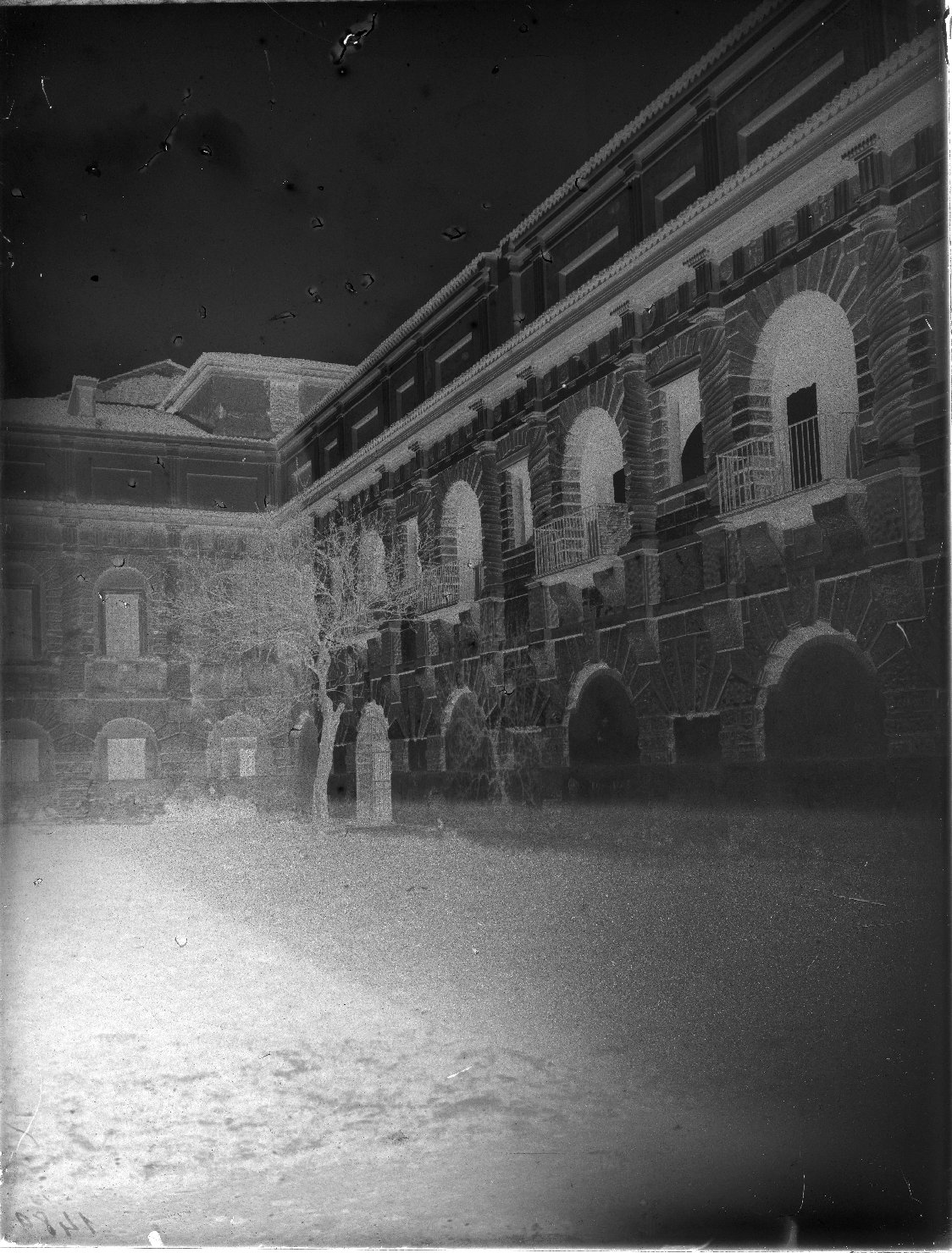 - NOTIZIE STORICO CRITICHE Nel 1556 il Bertani, architetto dei Gonzaga, propone di realizzare il cortile della Cavallerizza sulla base del corpo di fabbrica della Rustica ideata da Giulio Romano a partire dalla fine degli anni trenta. Il cortile è scandito dalle arcate in bugnato e dalle colonne tortili del secondo ordine. Alcuni interventi di restauro furono realizzati tra il 1899 e il 1905, quando l'architetto Achille Patricolo diventò amministratore del palazzo. Si tratta del rifacimento di metà del coronamento del cortile a seguito della caduta dei cornicioni, lo stesso Particolo dice "La caduta di alcuni pezzi di cornice antica....mi ha indotto a disporre il restauro....usando marmo e cemento, materiali che da quattro anni sono a Palazzo Ducale" , dichiarando apertamente un uso molto disinvolto del cemento decorativo, in quegli anni particolarmente in voga (Alberto Grimoldi, Manutenzioni e restauri tra Ottocento e primo Novecento, in Giuliana Algeri (a cura di), Il Palazzo Ducale di Mantova, 2003, pp. 341-354) ma solo tra il 1936 e il 1938 il cortile fu completamente ripristinato. L'immagine, fortemente sovraesposta, non consente una lettura agevole del soggetto; si evidenziano però le arcate superiori del lato est verso il lago già aperte (1933) mentre quelle sottostanti risultano tamponate. Possiamo ipotizzare una ripresa tra il primo e il secondo intervento di restauro del cortile (vedi: Clinio Cottafavi, Il Palazzo Ducale di Mantova. Ricordi e impressioni, in "Gonzaghesca", 1933, pp. 61-70; Alfredo Barbacci, Restauri artistici a Mantova e nel mantovano, in Mantus, n. 5, 1939, pp. 8-10)
